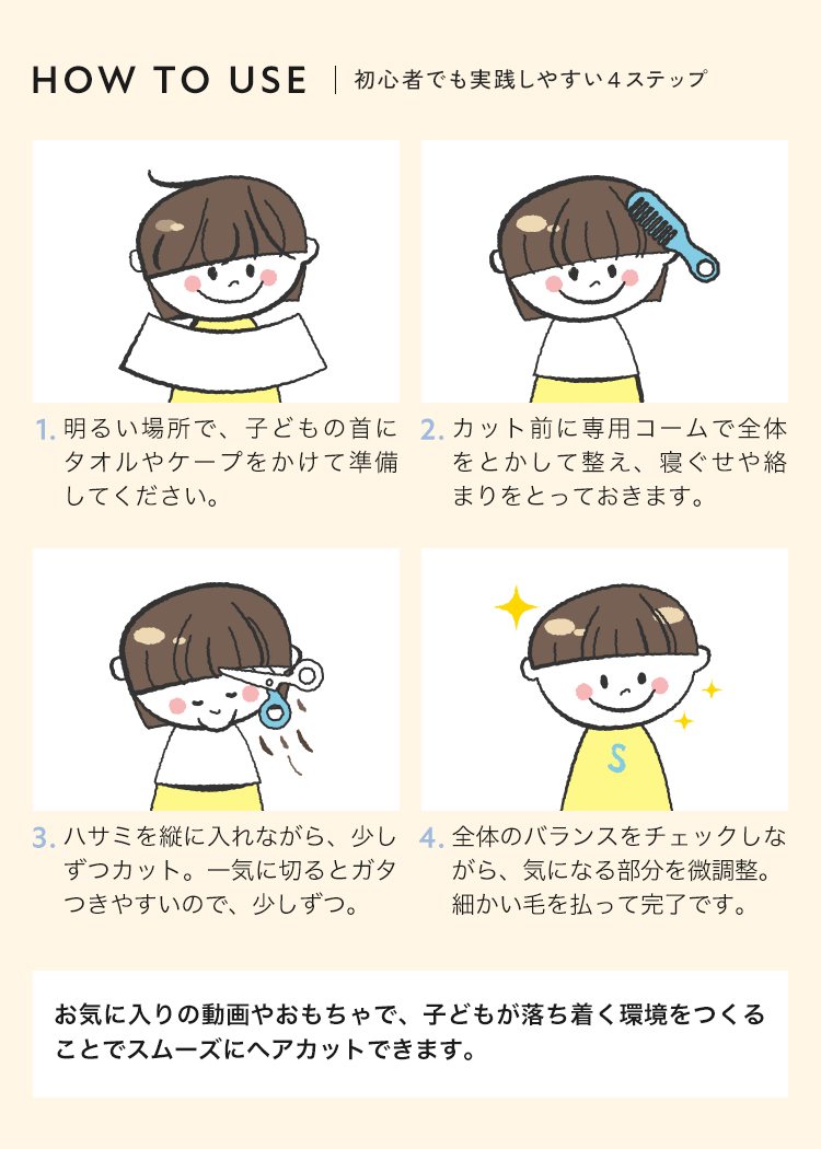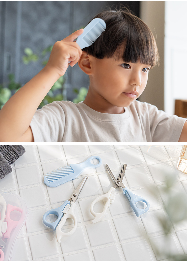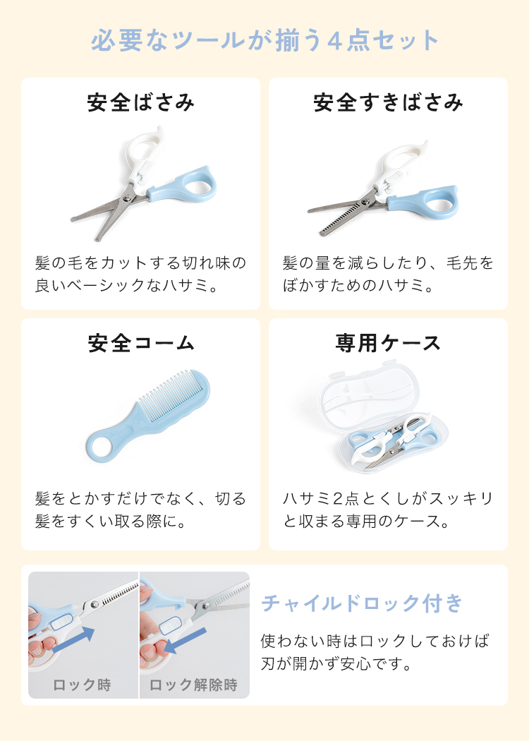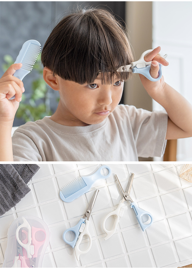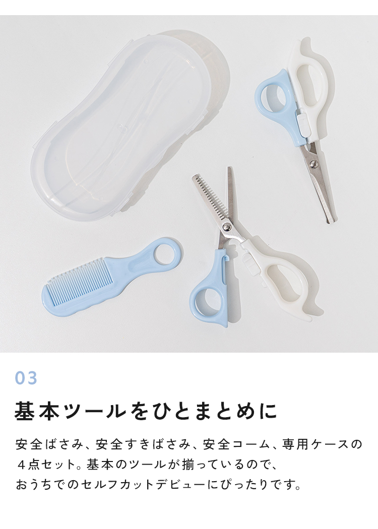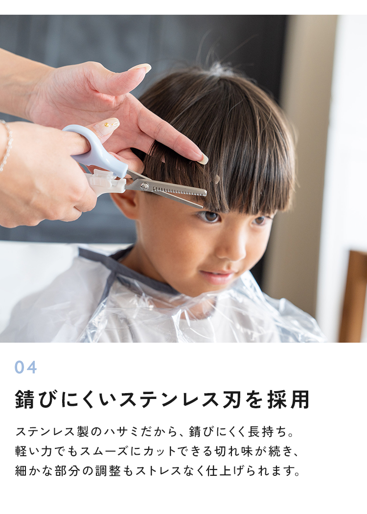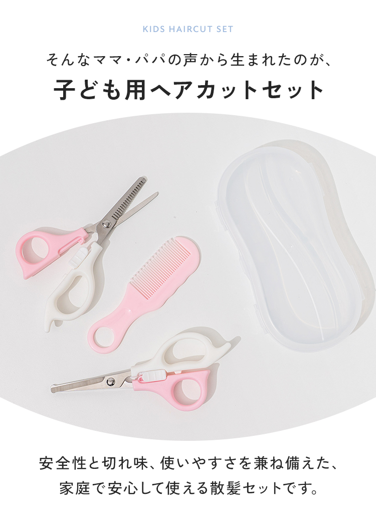 | ご家庭で安心して使える、子ども用の散髪セットです。 安全設計のはさみで、お子さまのヘアカットを手軽に、楽しく。 チャイルドロック付きで収納時も安心です。 安全ばさみ、安全すきばさみ、安全コームの3点を専用ケースにまとめて、持ち運びや収納も便利! |