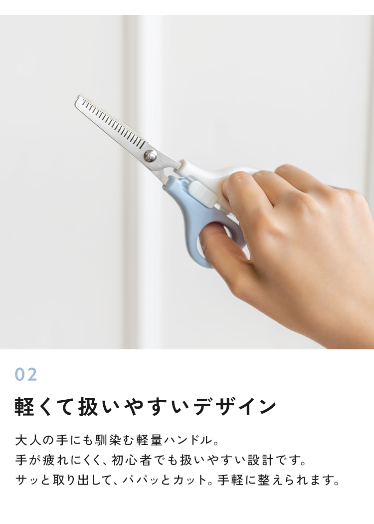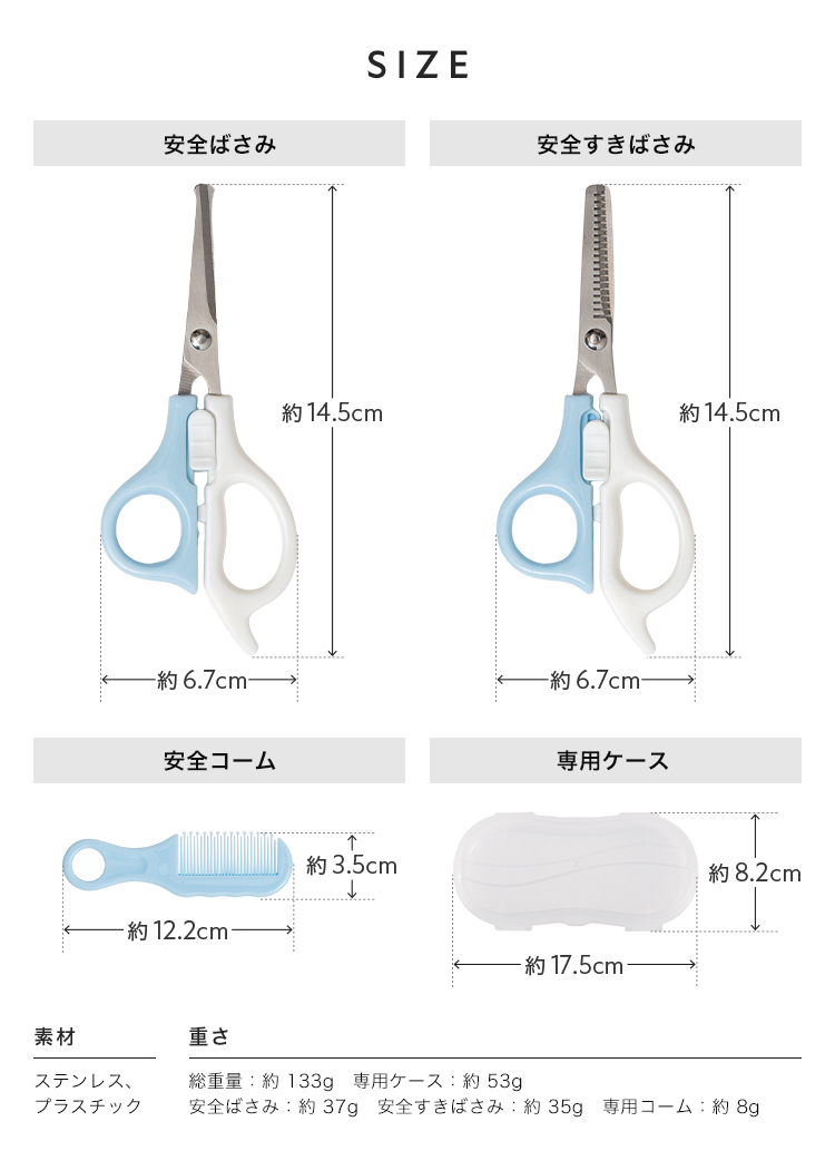 | 総重量:約 133g 専用ケース:約 53g 安全ばさみ:約 37g 安全すきばさみ:約 35g 安全コーム:約 8g |