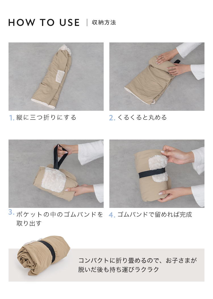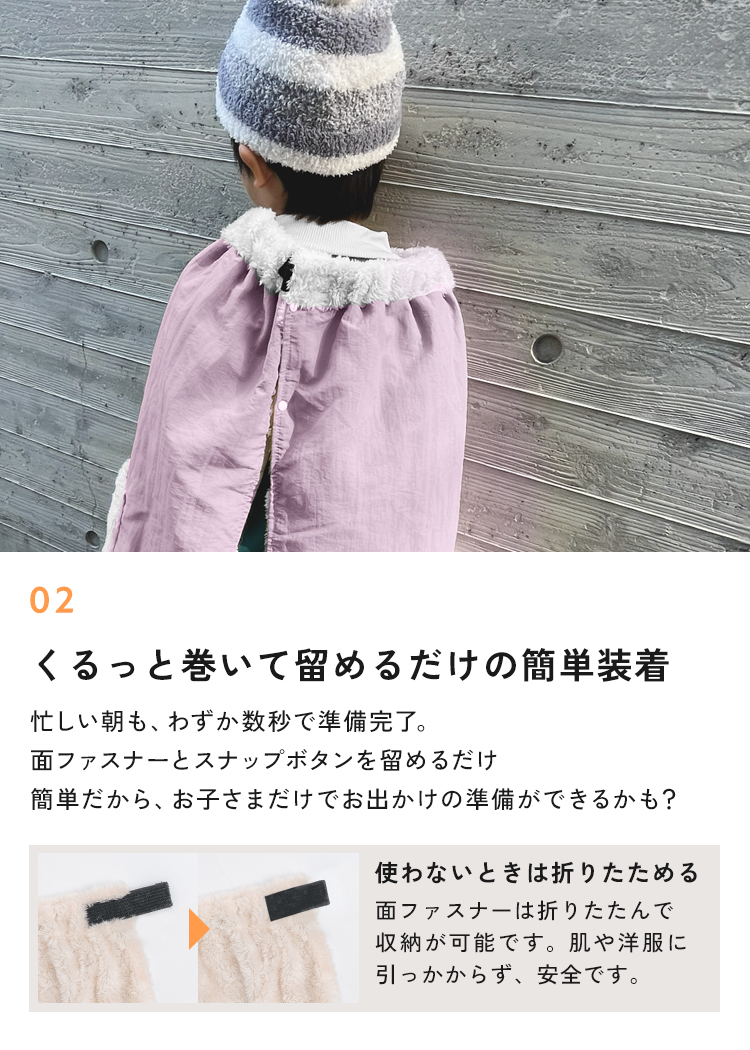 | 【商品説明】 冬の自転車送迎にぴったりの子ども用防寒ポンチョ。表地の風を通しにくいポリエステル生地と、裏地のふんわりとしたファー素材でしっかり保温。 くるッと巻いて留めるだけの簡単装着で、着たままでチャイルドシートへスムーズに座れます。裾が広がりにくい設計で自転車への巻き込みを防ぎます。 前に回すだけでマントのように羽織れて、そのままアウターとしての使用もOK。ベビーカーにも装着可能。コンパクトに畳めて持ち運びらくらく。 冬のお出かけを快適にする防寒アイテムです。 ■サイズ 本体 首回り:約46〜cm 丈:約72cm 横幅:約50cm 展開時 丈:約72cm 横幅:約107cm 折り畳み時 縦約18cm 横約14cm 高さ約11cm クリップパーツ 縦約21cm 横約1.8cm ■カラー ベージュ / チャコール / パープル ■素材 表生地:ポリエステル 裏ファー生地:ポリエステル スナップやクリップパーツ:ABS ■重量 約 275g ■セット内容 本体 クリップパーツ ■注意事項 ・本来の用途以外には使用しないでください。 ・濡れ、摩擦、汗、日焼け等により、色落ち、変色、色移りすることがありますのでご注意ください。 ・安全のため、自転車から降りた後はスリットを前に回し必ず手を出せる状態でご使用ください。 ・巻き込みにくい設計ですが、車輪やチェーン部分へ布地を近づけたり、意図的に巻き込ませるような行為はしないでください。 ・撥水効果は永続的なものではありません。ご使用やお手入れの状況により、効果が徐々に薄れる場合があります。 ・完全防水ではありません。長時間水に触れないようにご注意ください。 ・ポケットや裏地のファー素材は撥水しませんのでご注意ください。 ・商品到着時や開封直後のこもったニオイが気になる場合は、しばらく置いていただくと改善されます。 ・必ず洗濯ネットに入れ、単独で洗濯してください。 ・スナップやクリップは閉じてから洗ってください。 ・裏ファー部分は素材の特性上、多少の毛抜けや毛羽落ちが生じることがあります。 ・アイロン、乾燥機は使用しないでください。 ・製品仕様やパッケージは改良のため予告なく変更される場合があります。 ・サイズやデザイン、カラー等は生産時期やロットにより若干の差異が生じることがあります。 ・商品の色は、画面上の画像と実物とでは多少異なる場合があります。あらかじめご了承ください。 ・商品の特性上、サイズや色などに多少のばらつきがあります。 ・火気の近くや高温の場所で使用・保管しないでください。 ・高温・多湿、直射日光の当たる場所での保管はお避けください。カビや変形、変色などの原因となります。 |