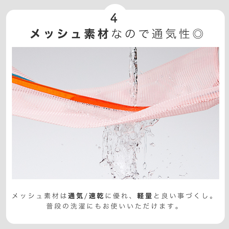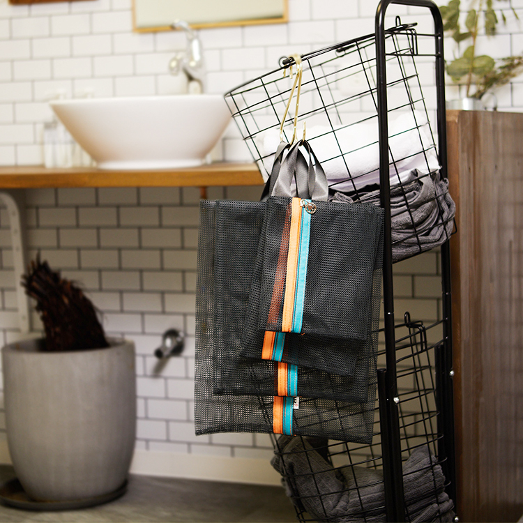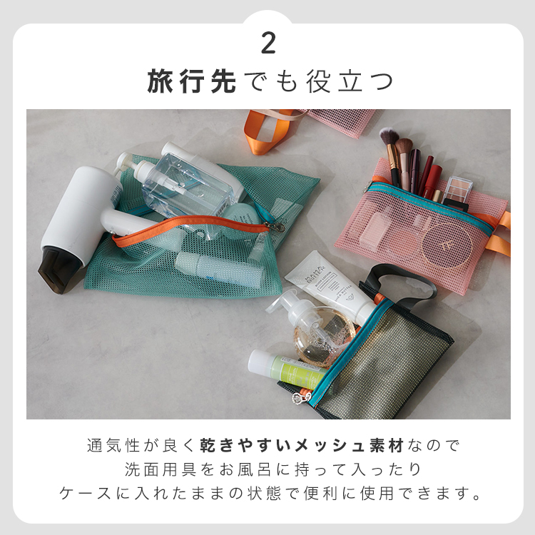 | 商品説明 | 散らかりがちなキャリーバッグの中をわかりやすくすっきり整理できます。 通気性が良く乾きやすいメッシュ素材なので洗面用具をお風呂にもっていったり ケースに入れたままの状態で便利に使用できます。 旅行から戻ったら汚れた衣類をそのまま洗濯機に! 衣類を守ってそのまま洗濯できます。 |