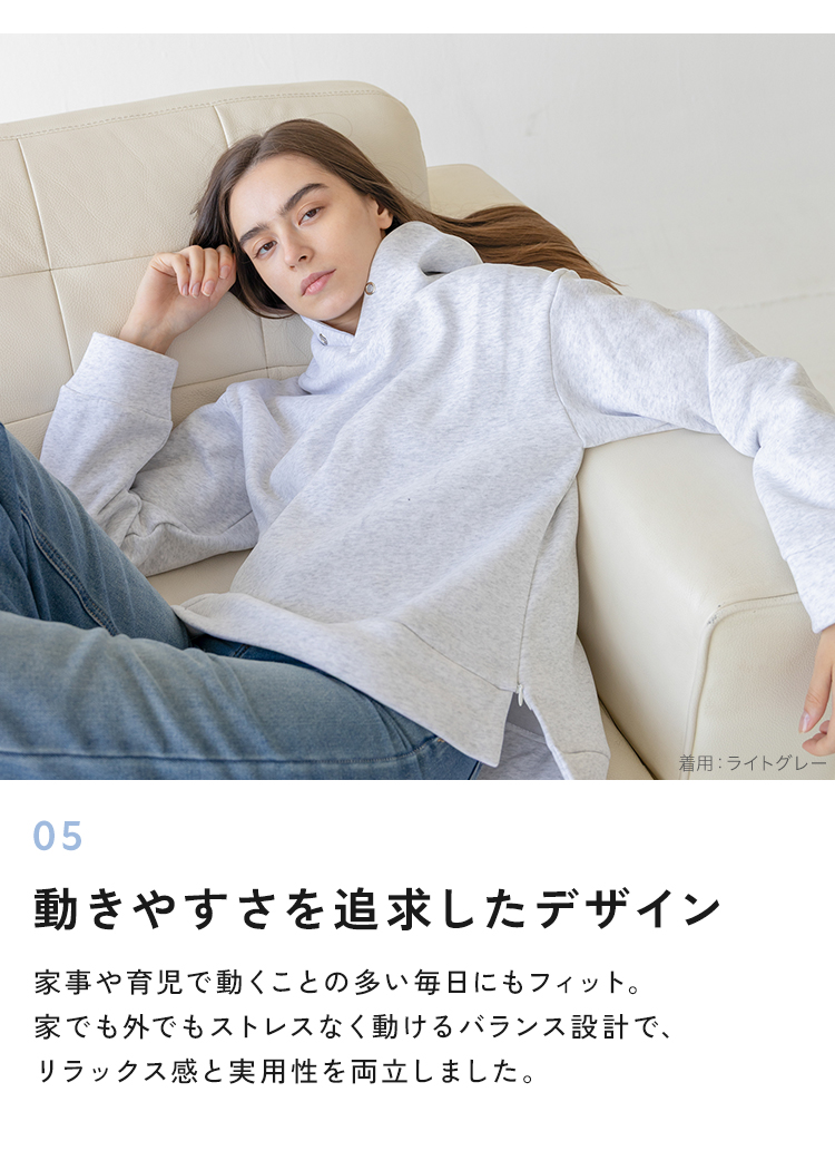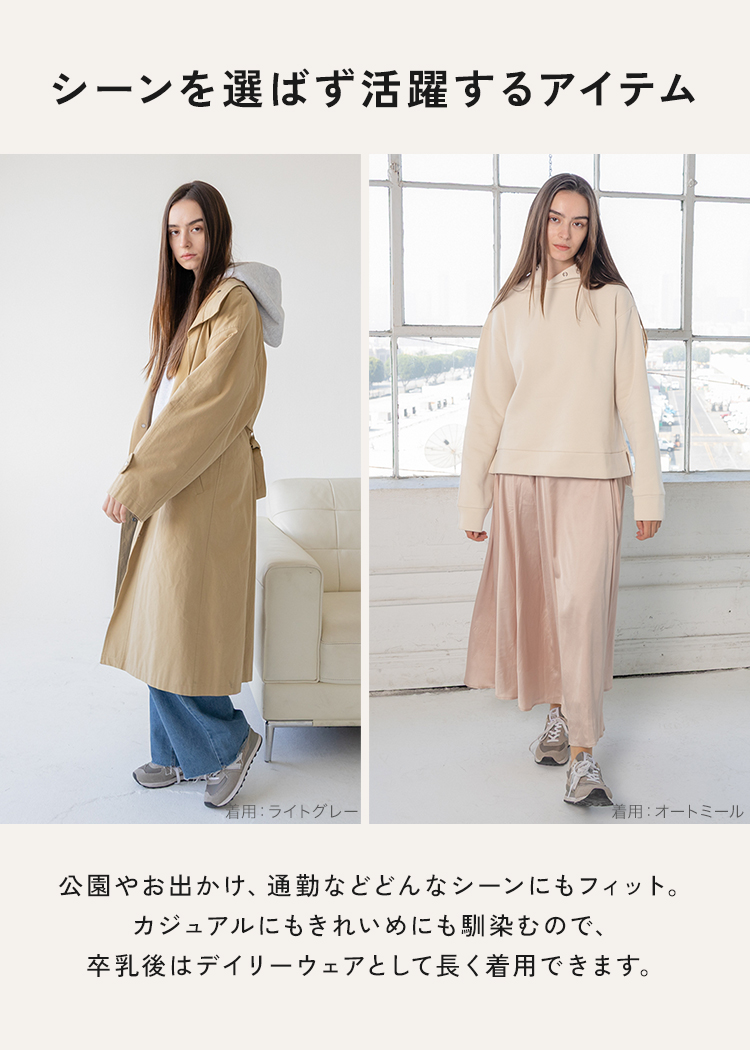 | 【商品説明】 上品さと実用性を両立した授乳&マタニティパーカー。ほのかな光沢をもつジャージー生地と、すとんと落ちるラインでラフすぎない上品なシルエットに。短毛の裏起毛で暖かく、肌あたりもやさしい仕上がり。脇下ファスナーの授乳口は外から見えにくく、産前から産後、卒乳後まで自然体で着られます。パンツにもスカートにも馴染む、シーンやテイストを選ばない万能アイテムです。 ■サイズ フリーサイズ ■カラー ブラック / ライトグレー / ベージュ※ / オートミール ※バーコードにはグレージュと記載されていますが、当販売ページでのカラー名ベージュと同一商品です。色味の違いはありません。 ■素材 コットン 50%、ポリエステル 50% ■重量 約 570g ■注意事項 ・本来の用途以外には使用しないでください。 ・製品仕様やパッケージは改良のため予告なく変更される場合があります。 ・サイズやデザイン、カラー等は生産時期やロットにより若干の差異が生じることがあります。 ・商品の色は、画面上の画像と実物とでは多少異なる場合があります。あらかじめご了承ください。 ・火気の近くや高温の場所で使用・保管しないでください。 ・高温・多湿、直射日光の当たる場所での保管はお避けください。カビや変形、変色などの原因となります。 |