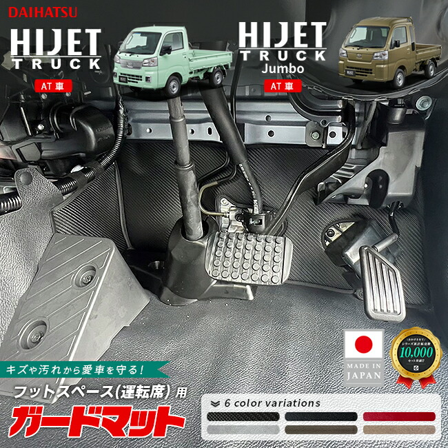 | 商品のおすすめポイント | ダイハツ ハイゼットトラック用のガードマットは、運転席側のフットスペースをしっかりと保護するために設計されたカスタムアクセサリーです。耐久性に優れた素材を使用し、キズや汚れから車内を守ります。特にAT車のS510PとS500Pモデルに適合し、簡単に取り付け可能です。6色のバリエーションから選べるため、内装に合わせたコーディネートが楽しめます。車内を清潔に保ちつつ、スタイリッシュに演出します。 |