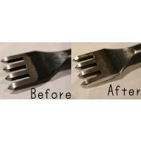 元から高品質なクラフト社の菱目打ちをベースに不要な角張りを削り落としつつ、刃の傷を形状が変わらない範囲で研磨してからバフ機で鏡面研磨して仕上げています。