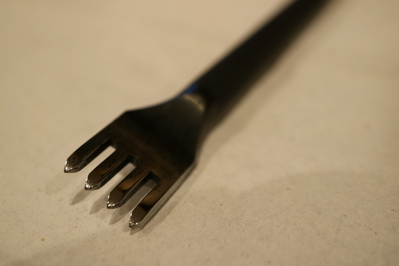 元から高品質なクラフト社の菱目打ちをベースに不要な角張りを削り落としつつ、刃の傷を形状が変わらない範囲で研磨してからバフ機で鏡面研磨して仕上げています。