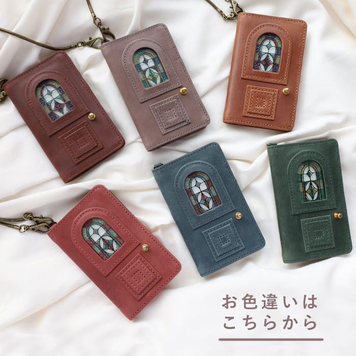 表・裏 リアルな扉を彷彿とさせるデザインです。  強化ガラスの特注ステンドグラス  ドアノブの裏に開閉ボタンがあります。(ドアノブは装飾です。開閉時はボタン部分に指を添えてくださいね)  しっとり、落ち着きのある質感のオイルレザー。 使い始めはマットな表面も、徐々にワックスが革の内部に染み込み、艶が出てきます。