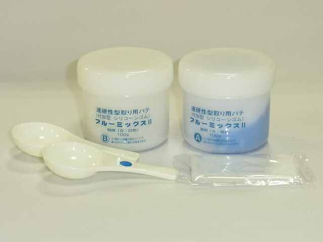 [内容]基剤(A剤:青) 100g触媒(B剤:白) 100g専用スプーン 2個ビニール手袋 1組※ブルーミックスがマイナーチェンジしました。A剤:白、B剤:青から、A剤:青、B剤:白に変更になりました。旧ブルーミックスとは混合しないでください。