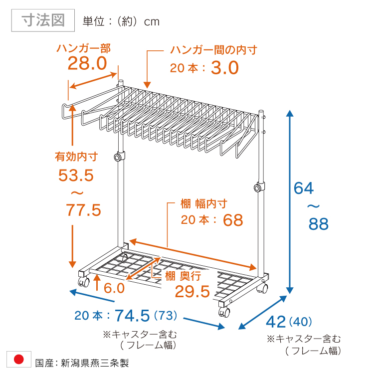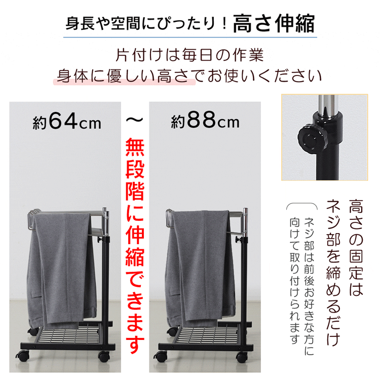 | 高さは64cmから88cmまで"無段階"に伸ばせます。 押入れやクローゼットの空間に合わせることが可能。 掛けやすい高さにすると、腰に負担が少なくなり使いやすさを実感いただけます。 | |||||