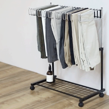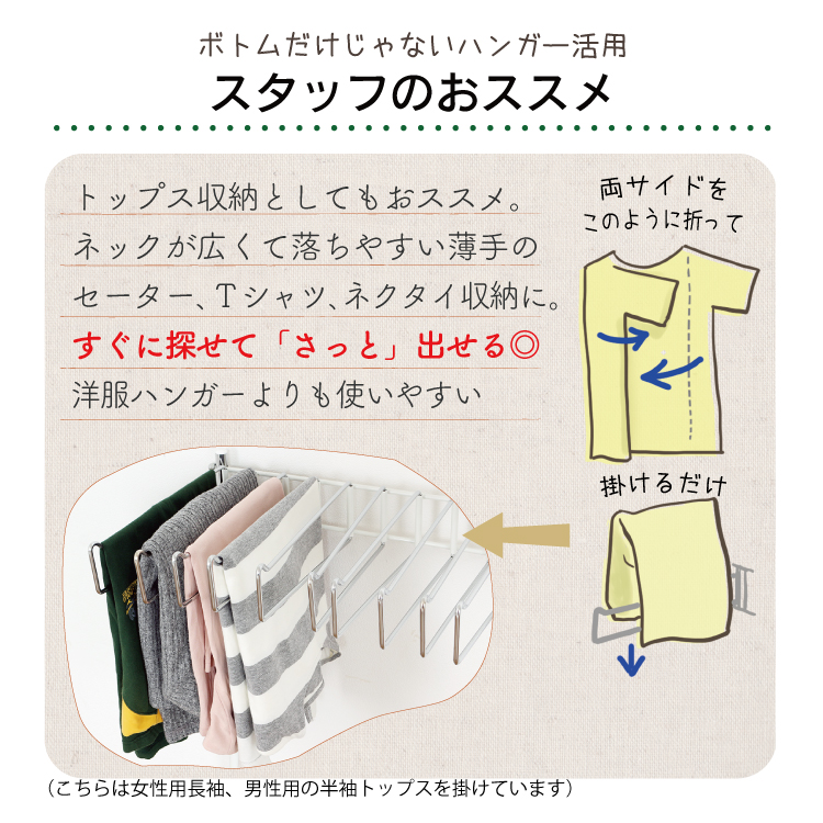 | ・ボトムが1列に並び探しやすい。 ・専用ハンガーのようにピンチで留める必要なし。 ・簡単収納なのにシワにもなりにくい。 ・「開いて」「掛ける」だけで片付け完了。 ・収納した姿が美しい収納ラック。 お忙しい方、片付けが苦手な方にもお勧めできる。 " 棚付き 高さ伸縮付き スラックスハンガーラック" | |||||