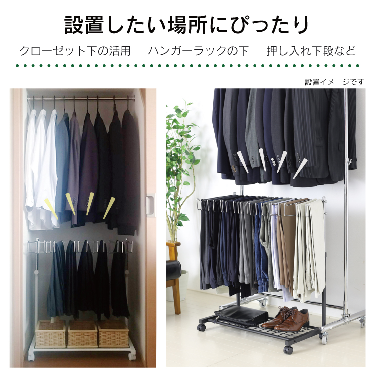 | ハンガーラックやウォークインクローゼット下などの限られたスペースにも最適。 | |||||