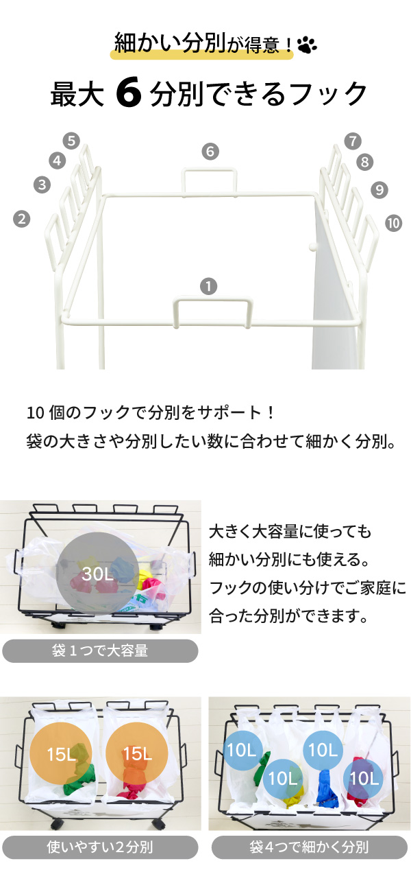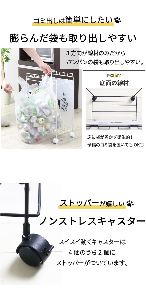 | 今にも遊びに行ってしまいそうな、猫のイラストがとっても可愛いダストワゴンです。 ◎可愛い猫のイラストでゴミ袋を目隠しできます ◎最大6分別できるため、細かい分別にも対応します ◎ストッパー付きキャスターで移動も固定もできる ◎すぐに使えて便利な、組立不要の完成品 ◎新潟県で生産した、安心品質の国産品 |