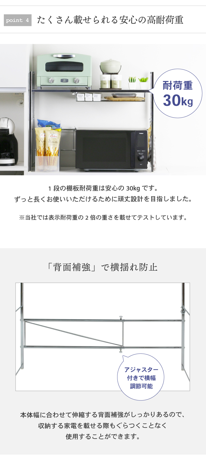 キッチンスペースに合わせて、幅と棚の高さが調節できるキッチン家電ラック。