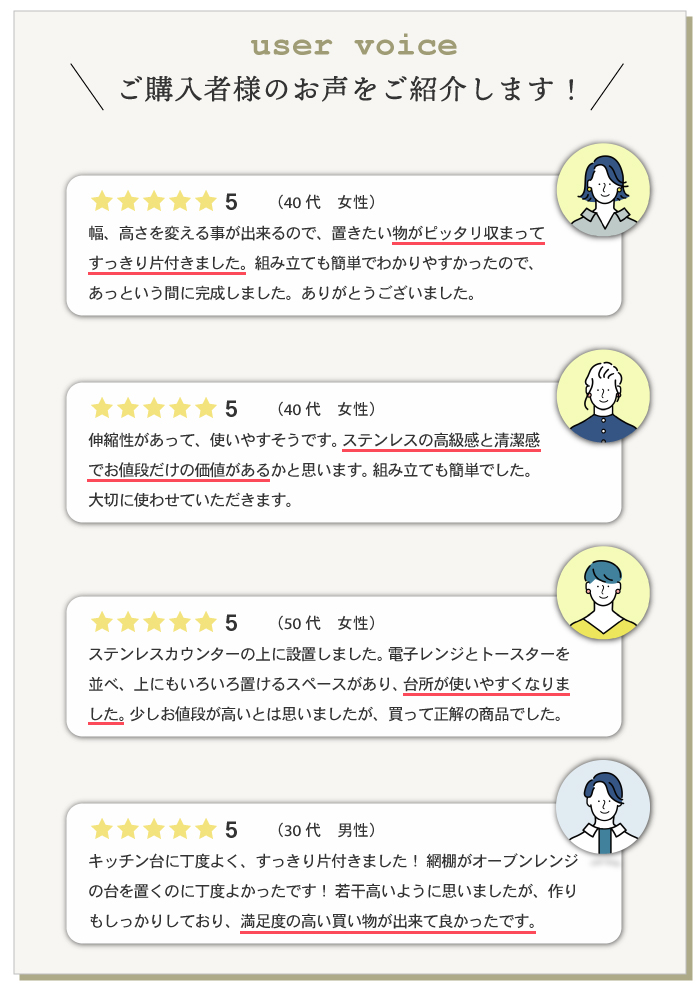 キッチンカウンターに置いてある電子レンジ、トースター、炊飯器、電気ポット、コーヒーメーカーなどの家電の上のスペースを有効利用できます。