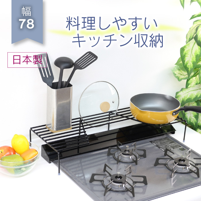コンロ奥ラック 高足 ワイド 幅 78 cm 日本製 完成品 頑丈 コンロ奥 棚 フライパン 高さ キッチン ラック コンロ奥 排気口カバー 対応 ブラック 黒 75 川口工器