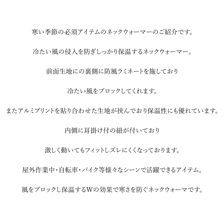 風をブロックし保温するWの効果で寒さを防ぐネックウォーマです。
