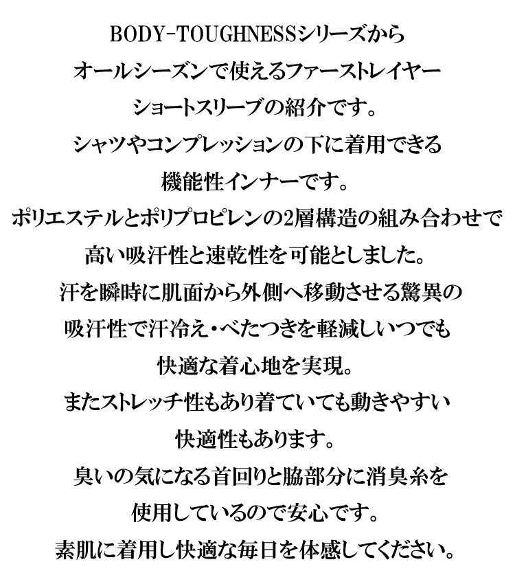 BODY-TOUGHNESSシリーズからオールシーズンで使えるファーストレイヤーショートスリーブの紹介です。