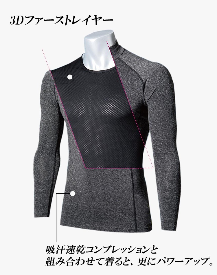 汗を瞬時に肌面から外側へ移動させる驚異の吸汗性で汗冷え・べたつきを軽減しいつでも快適な着心地を実現。