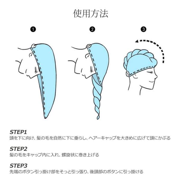 髪の毛をキャップ内に入れてらせん状に巻きあげ、ボタンで留めるだけ。