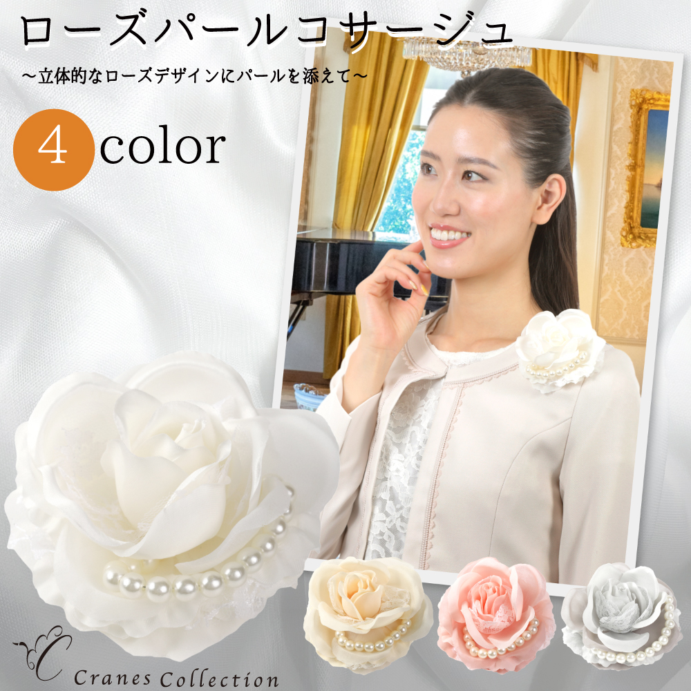 ふんわりした花びらを重ね、立体的なローズコサージュに仕上げました。さらにワイヤーで組み付けたパールがアクセントに、全体的にキュートな雰囲気になっております。