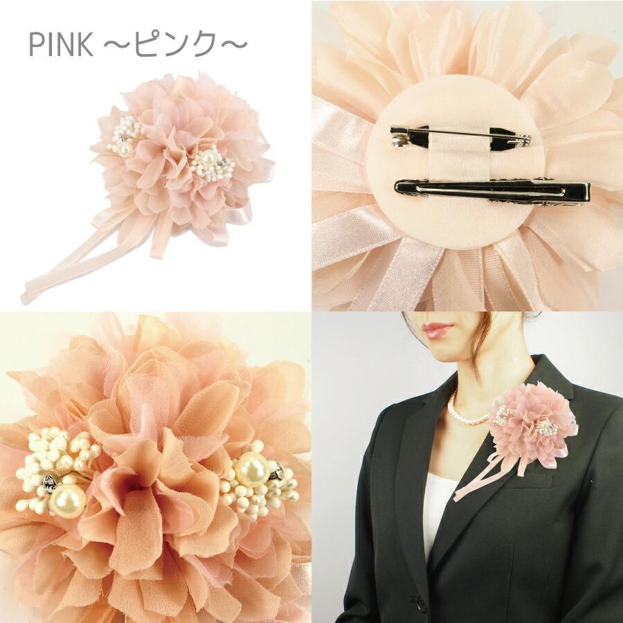 ふんわりとしたシフォン生地にパールやラインストーンがあしらわれた上品なコサージュです。また、ふわっとした綺麗な生地の重なりが可愛らしいデザインです。