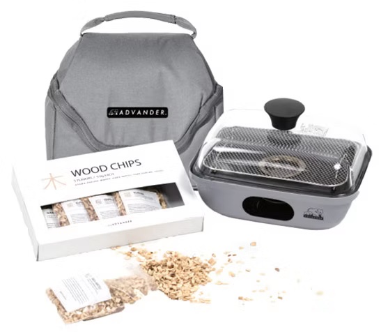 燻製初心者の方でも楽しめる、固形燃料式の燻製器に加え、専用ケースとウッドチップがセットになります。