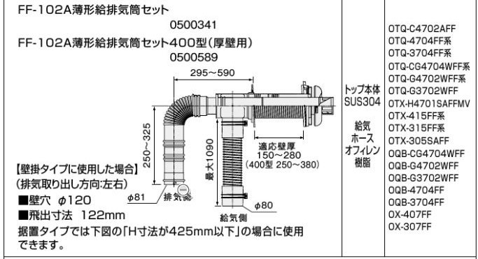 ノーリツ FF-102A薄形給排気筒セット 左右出し用 0500341 石油給湯機部材 NORITZ
