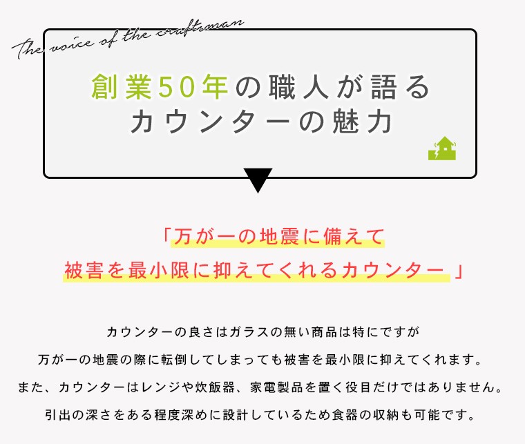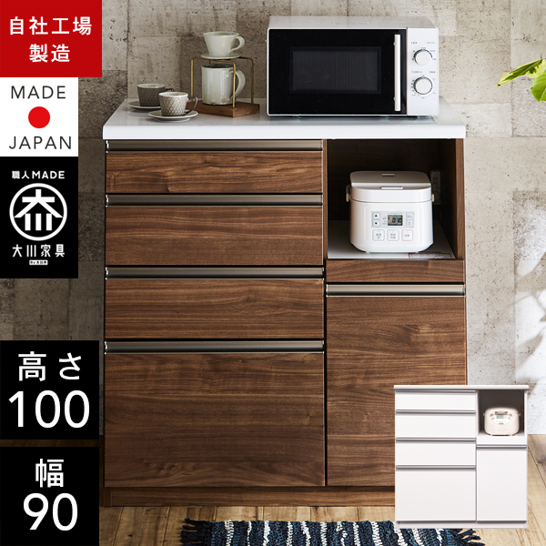 | 商品説明 | ・カウンターの高さが100cmとハイタイプなので長時間作業しても疲れにくく快適にご使用いただけます。 ・扉内部は6cm間隔で3段階での高さ調節が可能です。 ・引出しの内部は汚れてもさっと拭き取れるラッピング加工を施しておりますのでとっても衛生的です。 ・底板・中仕切り板も化粧板を施していて収納しても木の粉が付かないので衛生的で安心してご使用いただけます。 ・カウンターの裏面も化粧仕上げとなっておりますのでお部屋の間仕切りとしてもご使用いただけます。 ・引出しはすべて四方箱組構造なのでとっても頑丈な設計です。 ・本体は完成品なので組立商品に比べて耐久性も良くとっても頑丈なつくりなのでながくご使用いただけます。 ・安心の国産・大川産なのでとっても安心です。 |