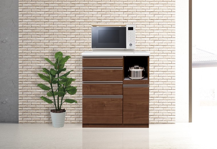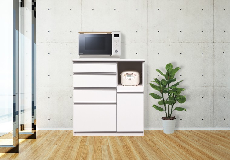 | サイズ[cm] | 外寸:幅90×奥行48×高さ100cm オープンスペース内寸:幅31.9×奥行43×高さ32cm 上から1段目引出内寸:幅46.5×奥行37.5×高さ7cm 上から2・3段目引出内寸:幅46.5×奥行37.5×高さ13cm 深内寸:幅46.5×奥行37.5×高さ18(有効31)cm 扉内寸:幅49×奥行(棚板29)43×高さ49cm |