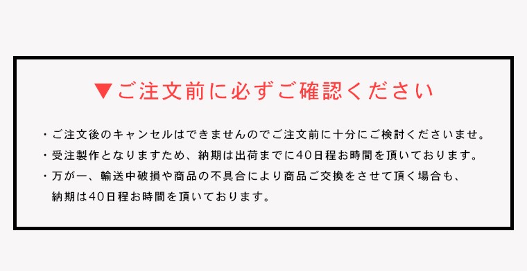 | 再配達につきまして | ※配送日時のご注意となりますので事前に必ずお読みくださいませ。 弊社はメールで事前に配達日時のご連絡をさせて頂いております。 お約束の日時にご不在の場合、また配達日の3日前に日時変更をされた場合は再配達料金(別途15,000円税別〜)が発生致します。 再配達料金はお客様でのご負担となりますのでご注意くださいませ。 |