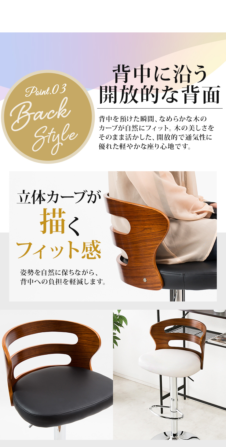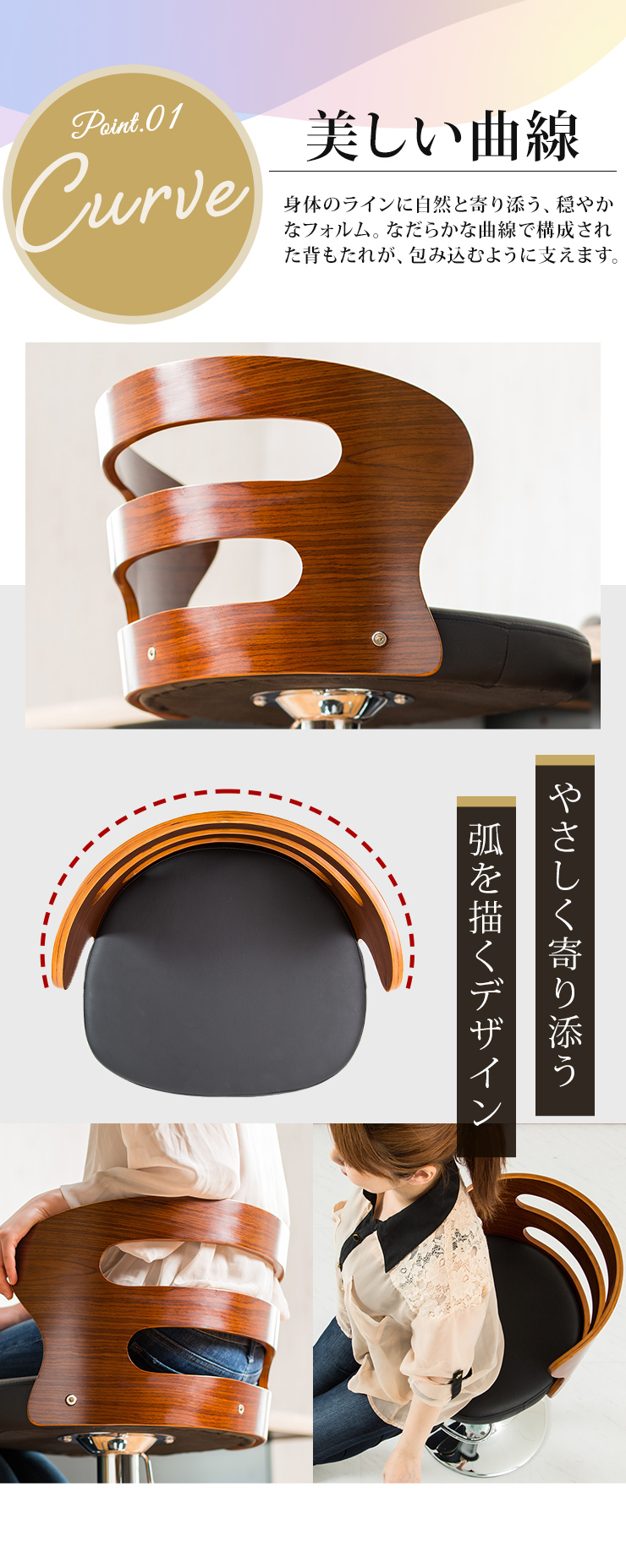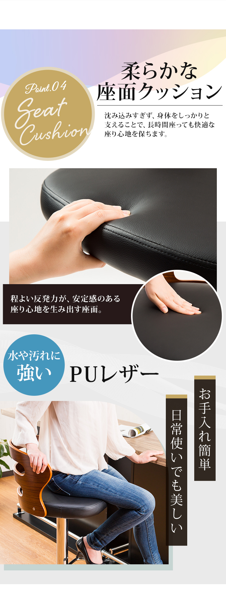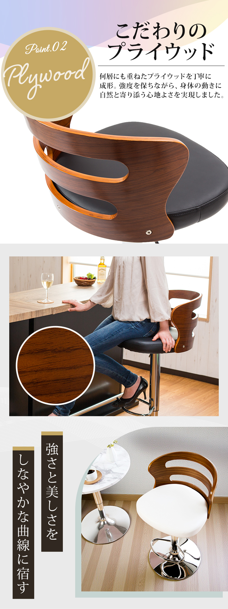 カウンターチェア 木製 バーチェア チェア クッション 背もたれ 曲線 広々座面 プライウッド 木目 PU 昇降 360度回転 業務用