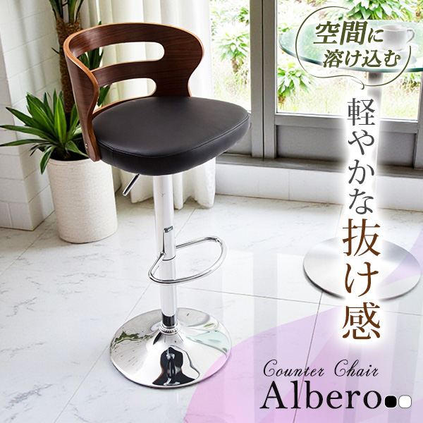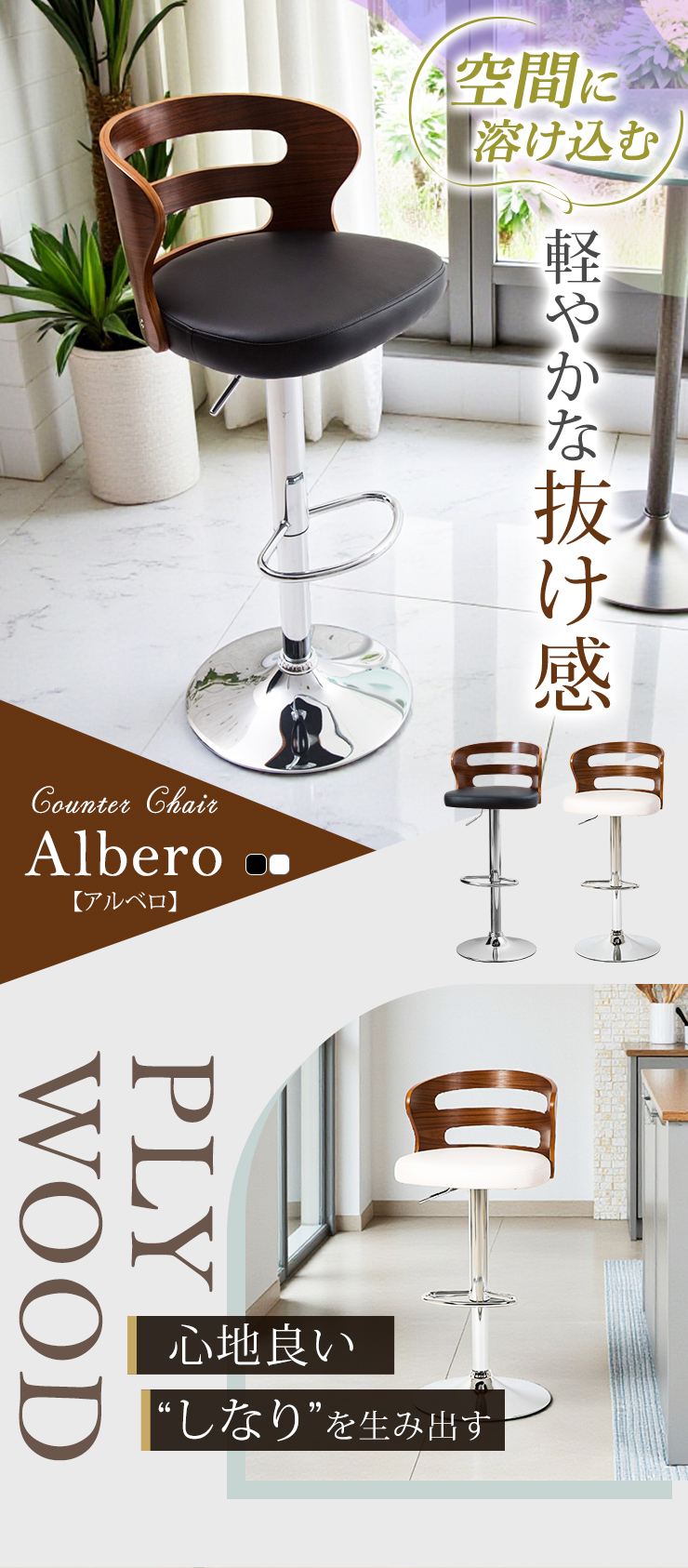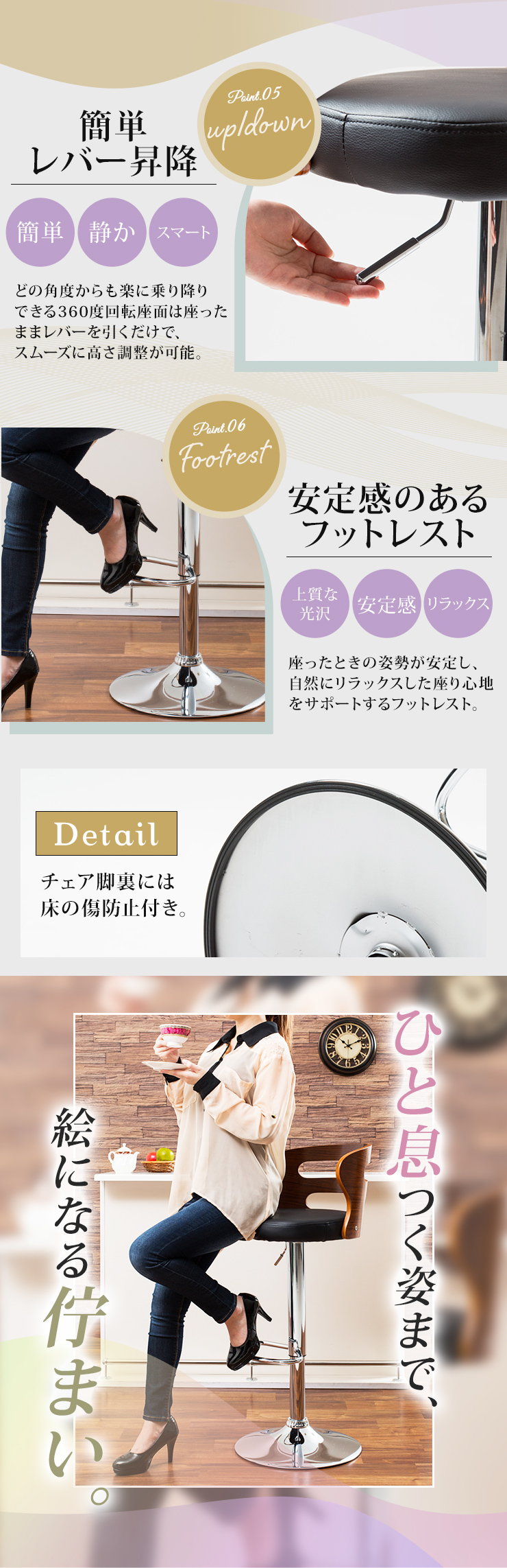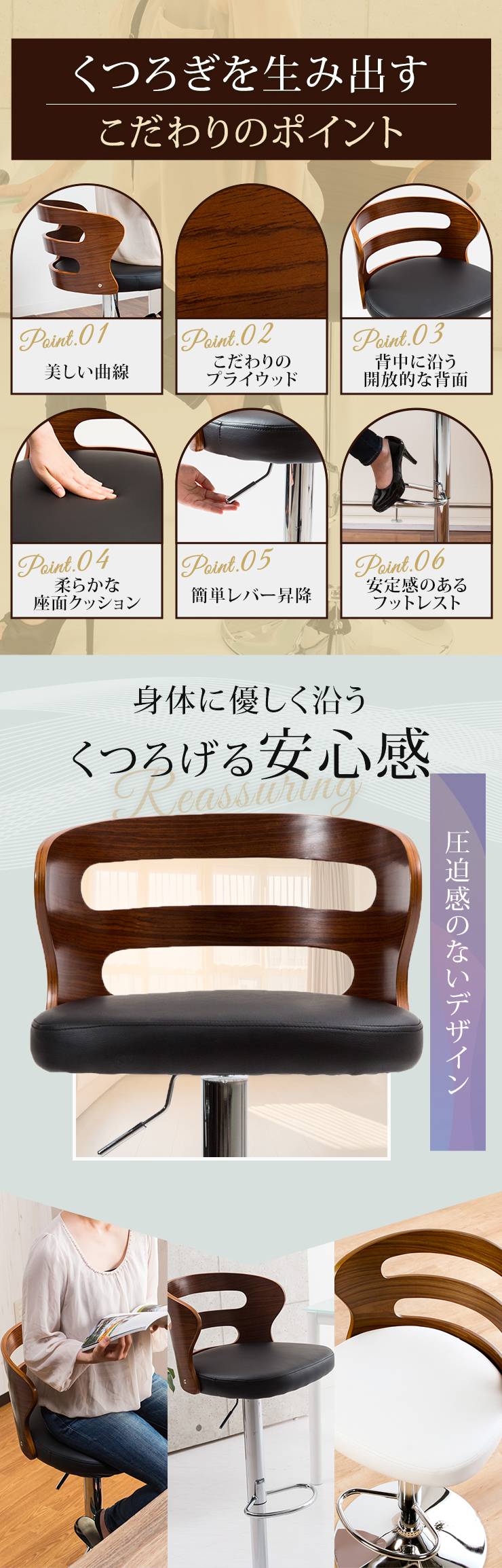 カウンターチェア 木製 バーチェア チェア クッション 背もたれ 曲線 広々座面 プライウッド 木目 PU 昇降 360度回転 業務用