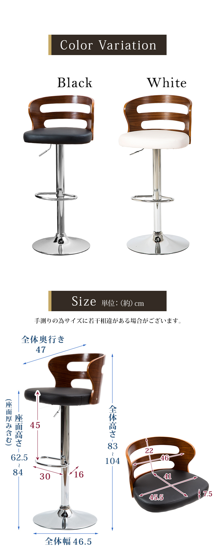 (約)幅46.5cm 奥行き47cm 高さ83〜104cm 座面の高さ62.5〜84cm