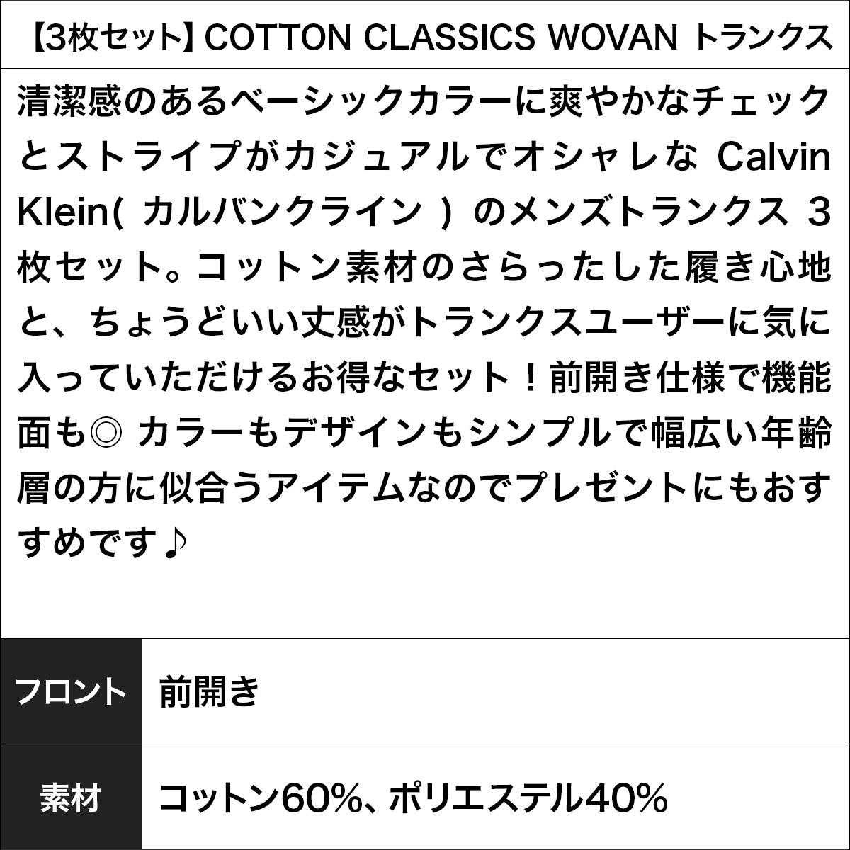 カルバンクライン 下着 トランクス 3枚セット メンズ Calvin Klein 男性 下着 紳士 父 新生活 プレゼント COTTON CLASSICS WOVAN コットン 前開き CK