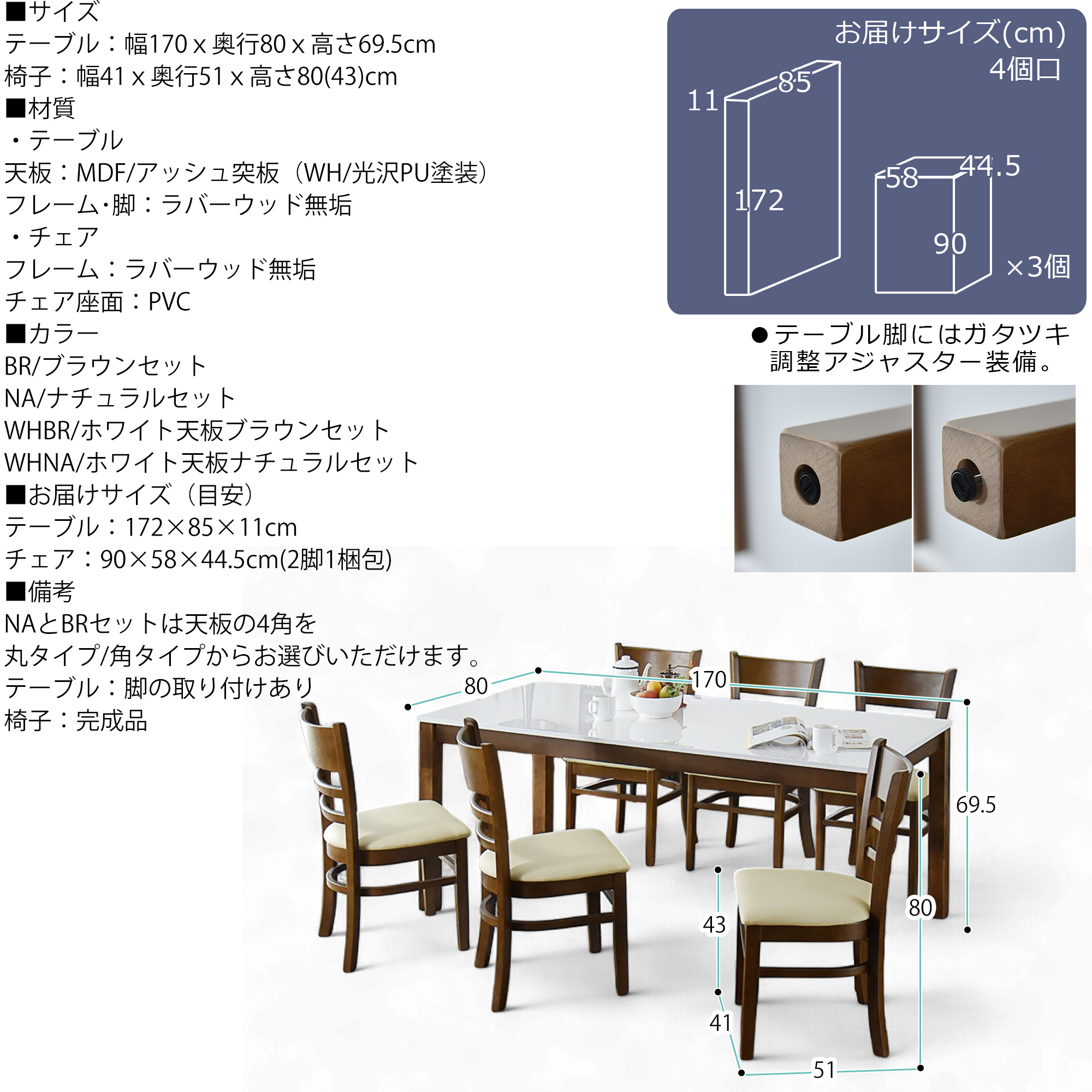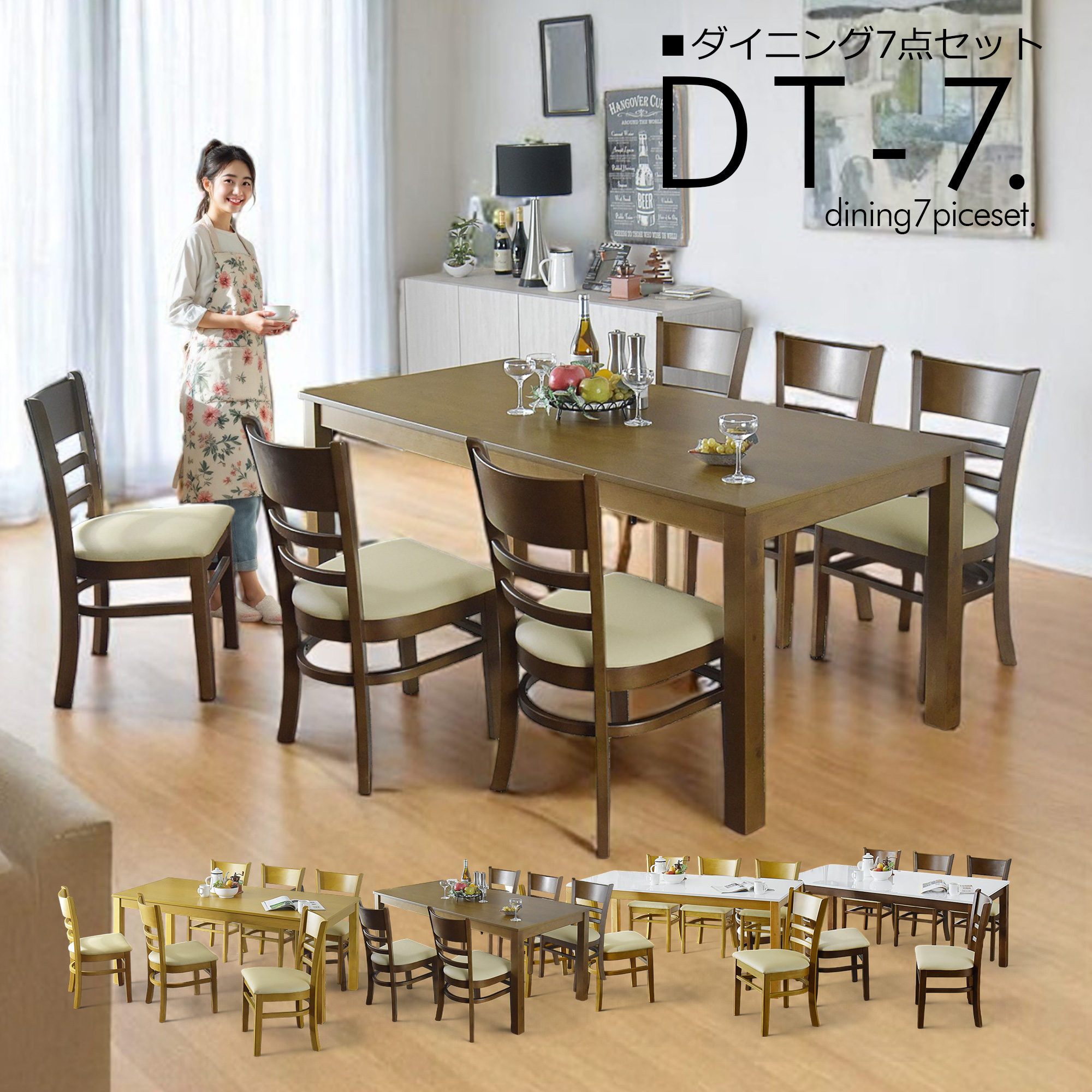 ・ナチュラル色/テーブルの四隅が角張ったタイプ【角】+チェア6脚