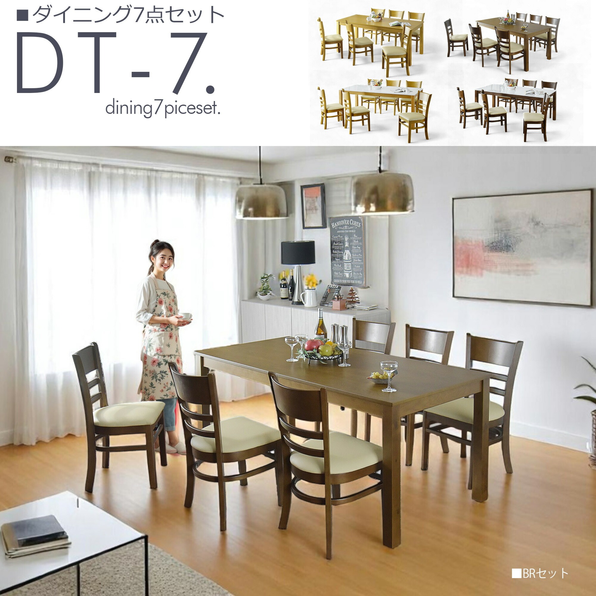 ・ブラウン色/テーブルの四隅が角張ったタイプ【角】+チェア6脚