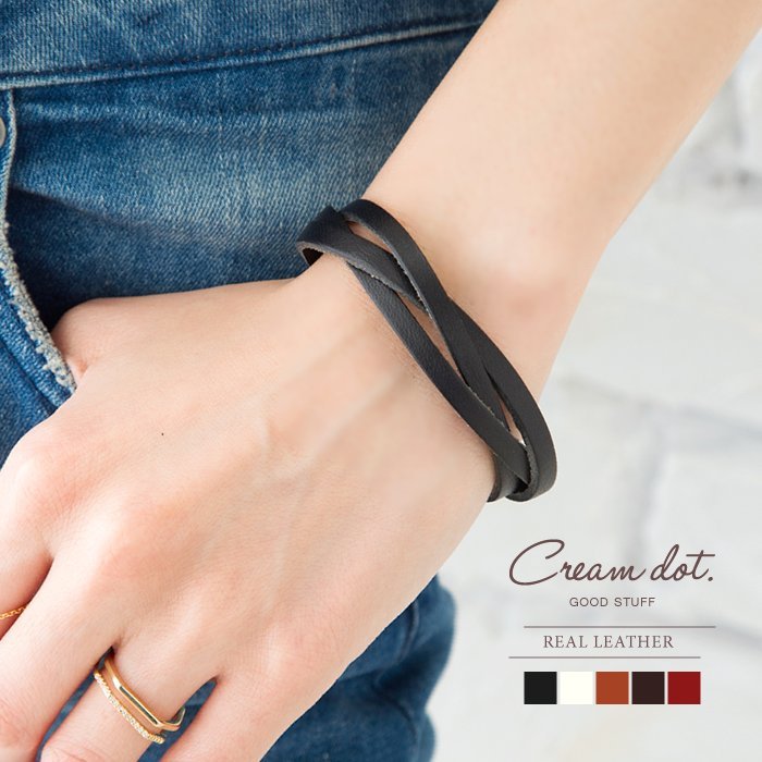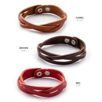 手元に存在感を与えてくれるリアルレザーブレスレット。3本を編み合わせることで、より表情豊かな印象になり、アクセント効果もアップ。2段階調節可能なスナップボタン付きで、着脱も楽ちんです。