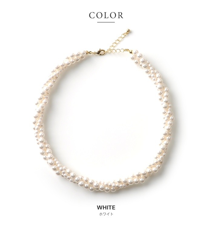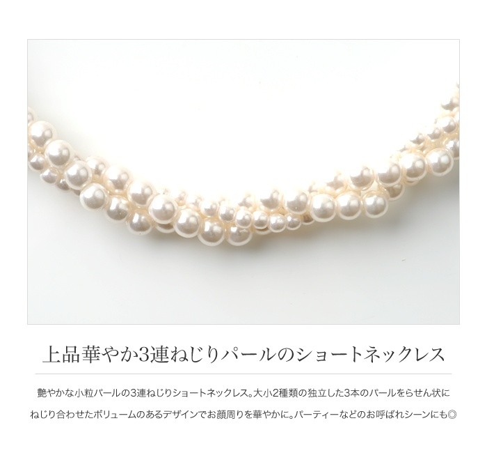 艶やかな小粒パールの3連ねじりショートネックレス。大小2種類の独立した3本のパールをらせん状にねじり合わせたボリュームのあるデザインでお顔周りを華やかに。パーティーなどのお呼ばれシーンにも◎
