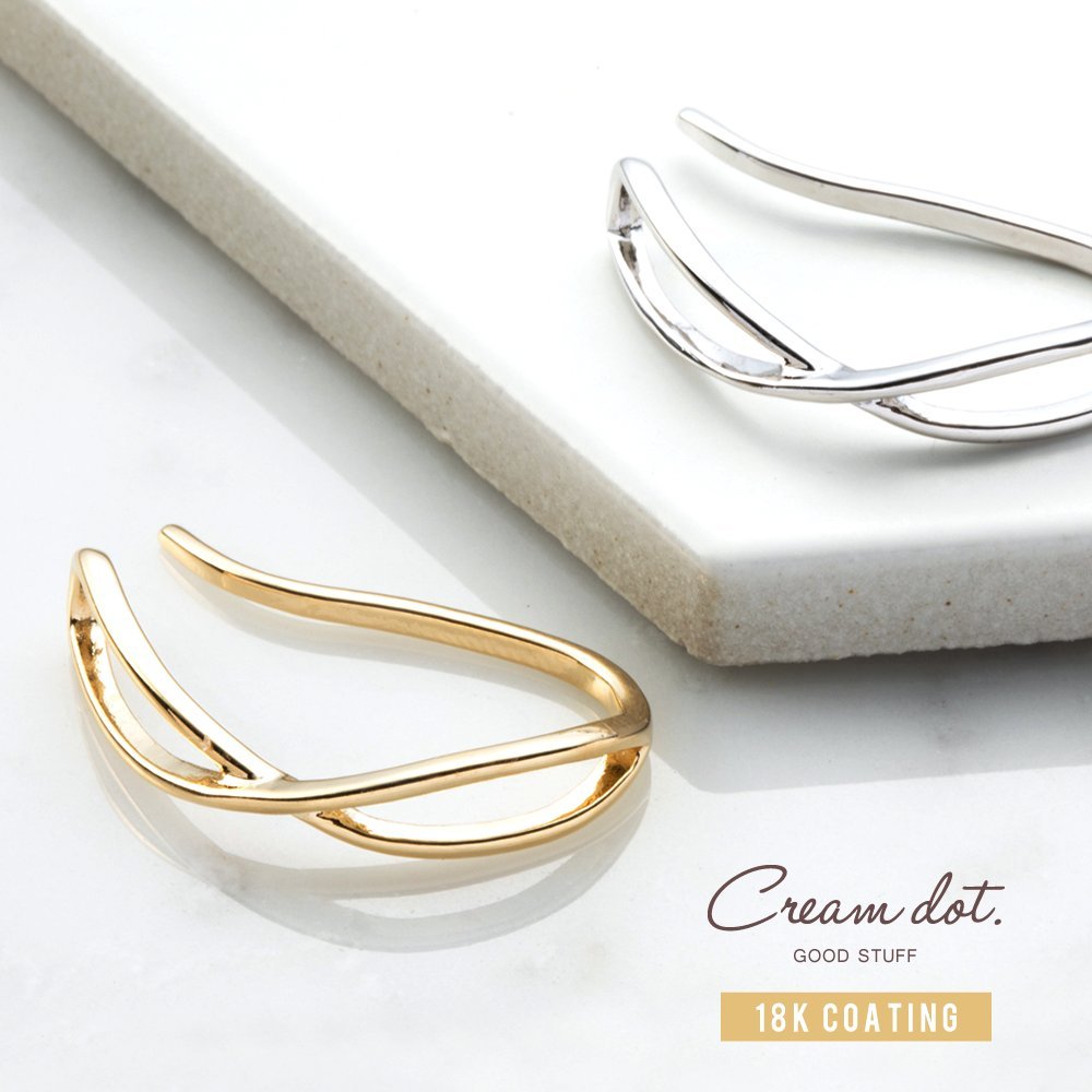 シンプルなクロスラインが大人映えする大きめイヤ―カフ。下から耳たぶに引っかけるだけの簡単装着で、大きめだけどシンプルなメタルラインが上品さもプラス。シンプルコーデのアクセント使いにGOOD。