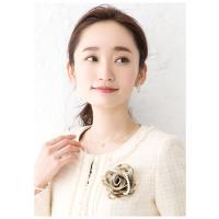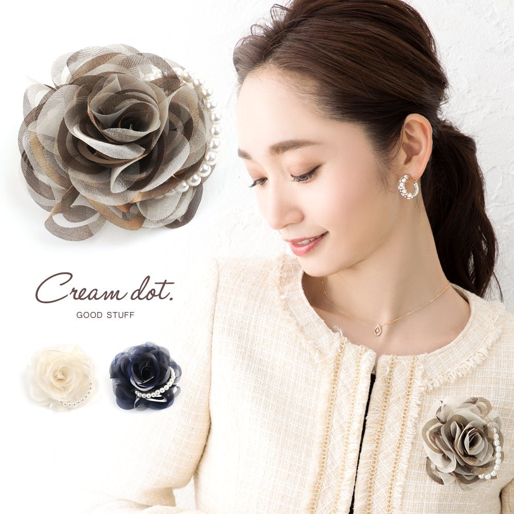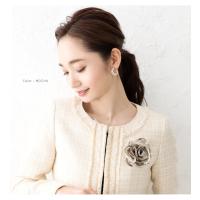 透け感のあるフラワーと艶めくフラワーをボリュームたっぷりに重ねた、大人っぽくて上品なコサージュ。スーツ・ドレスを問わず、パーティーやフォーマルシーンにマッチして華やかな装いに仕上がります。