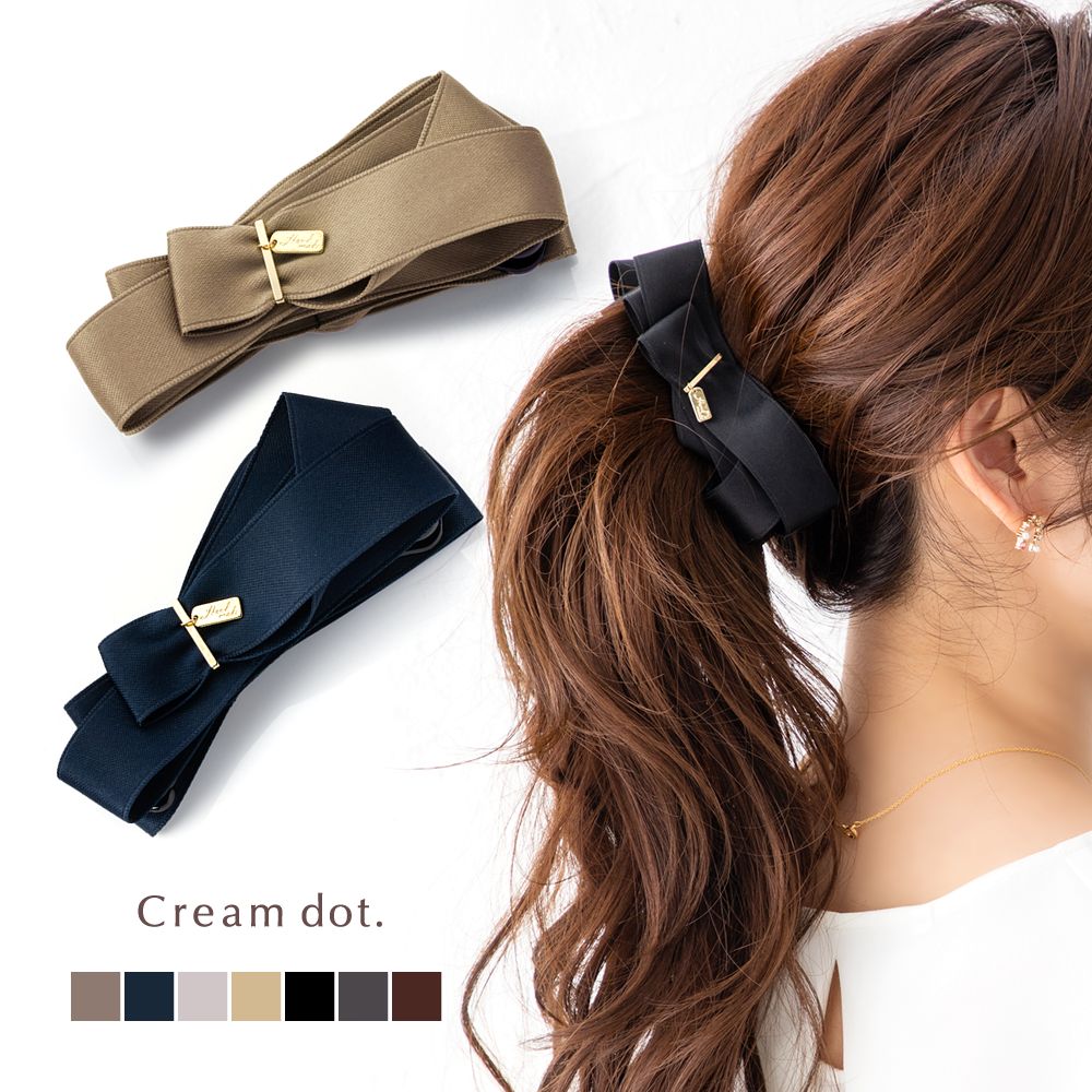アシンメトリーに重ねたリボンに、揺れるゴールドプレートがアクセントを加えるバナナクリップ。髪がしっかり留まる大きめサイズながら、艶やかな生地感とシックな色合いで幼くならず、まとめ髪を大人華やかに仕上げます。