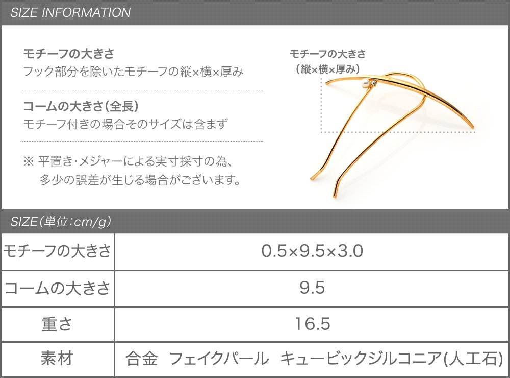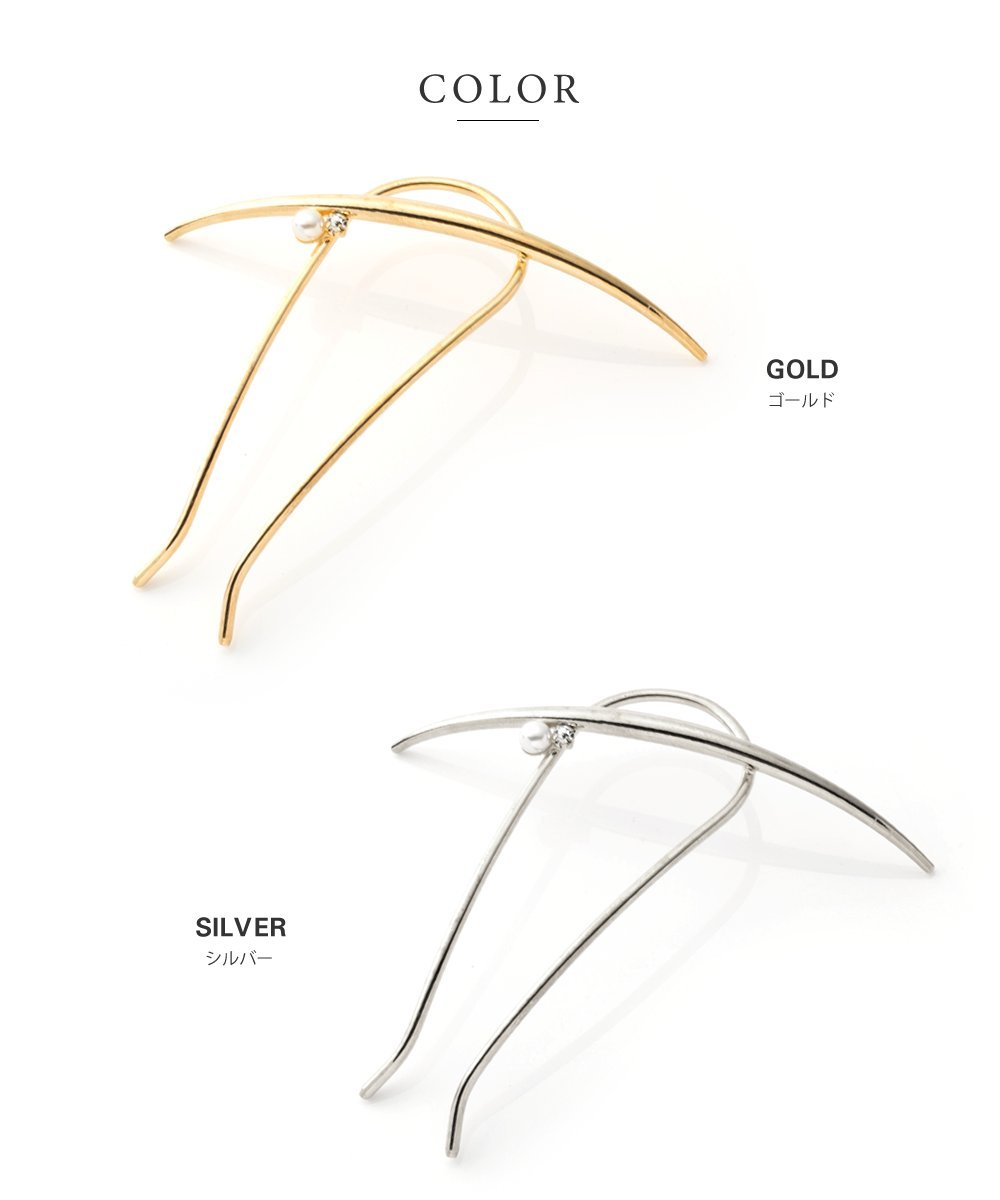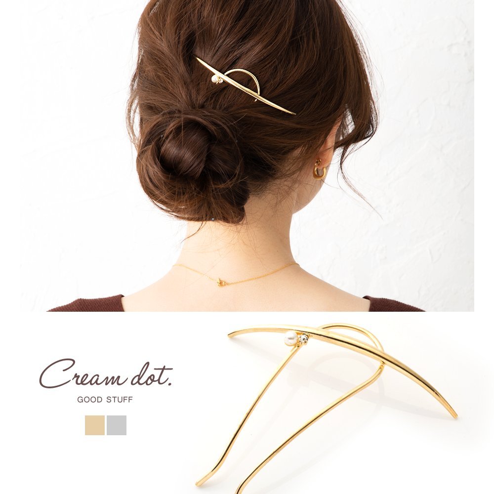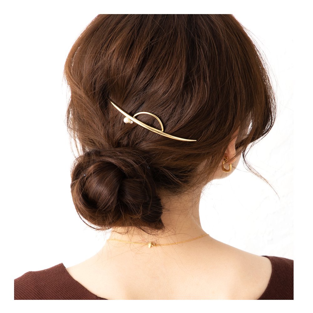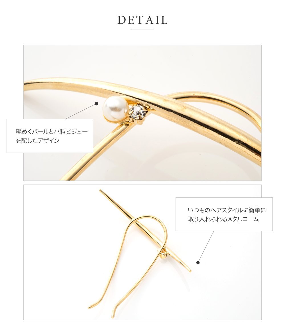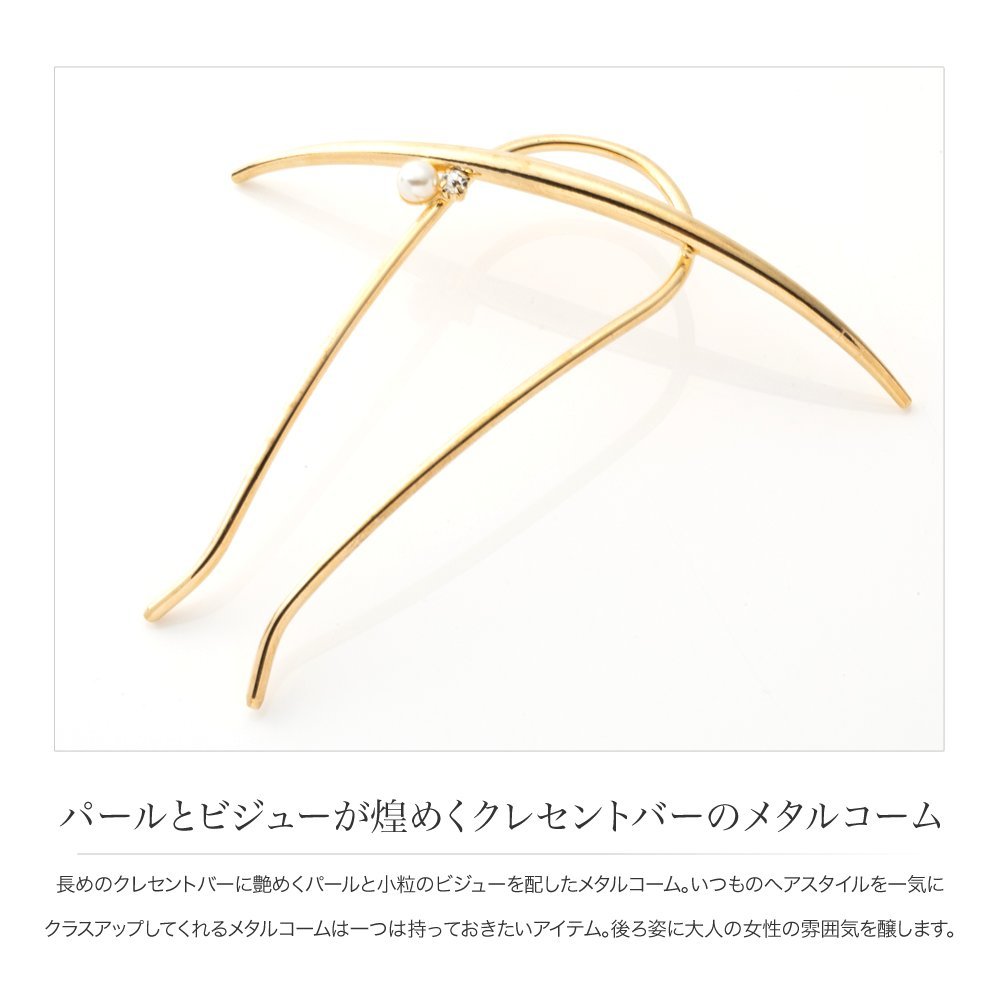 長めのクレセントバーに艶めくパールと小粒のビジューを配したメタルコーム。いつものヘアスタイルを一気にクラスアップしてくれるメタルコームは一つは持っておきたいアイテム。後ろ姿に大人の女性の雰囲気を醸します。