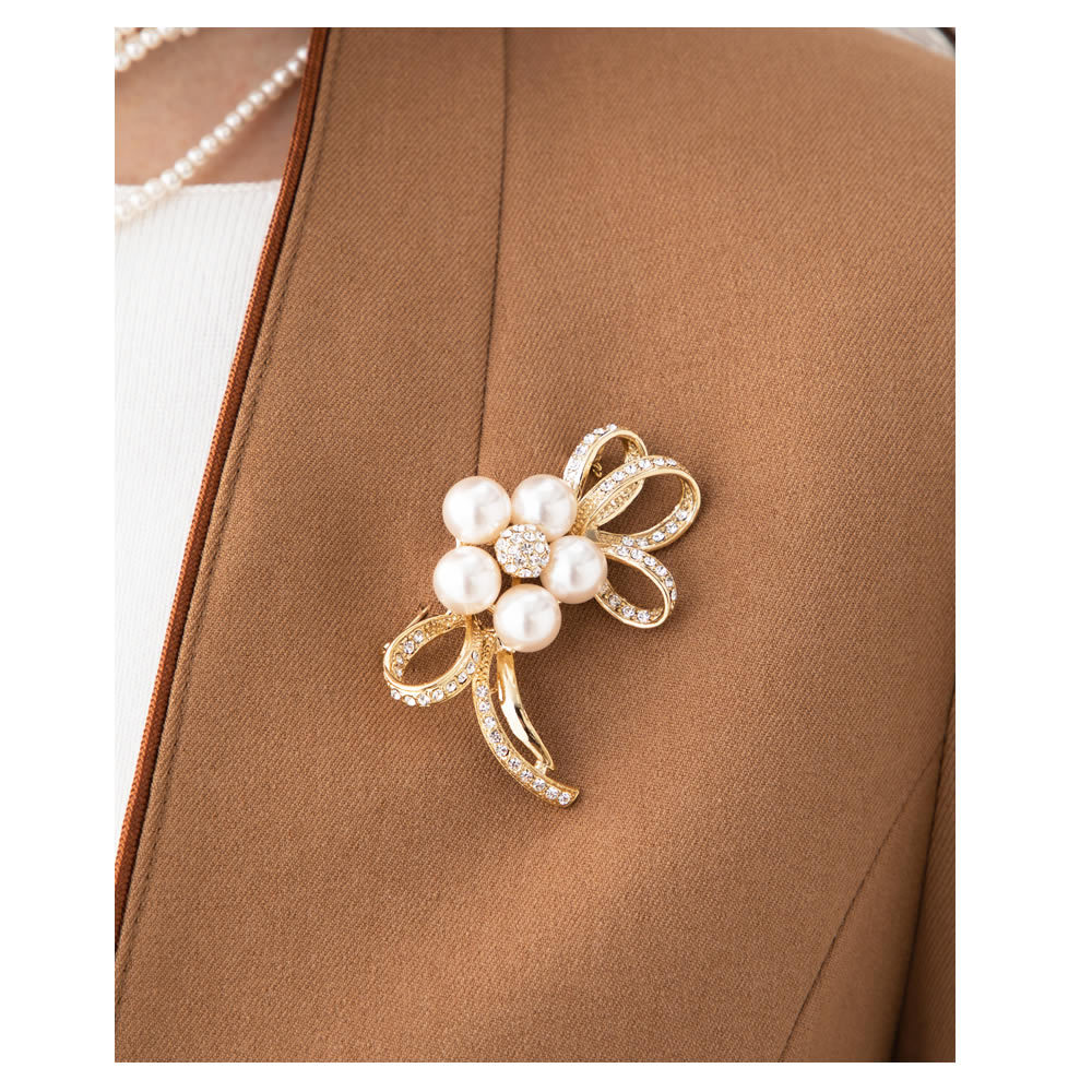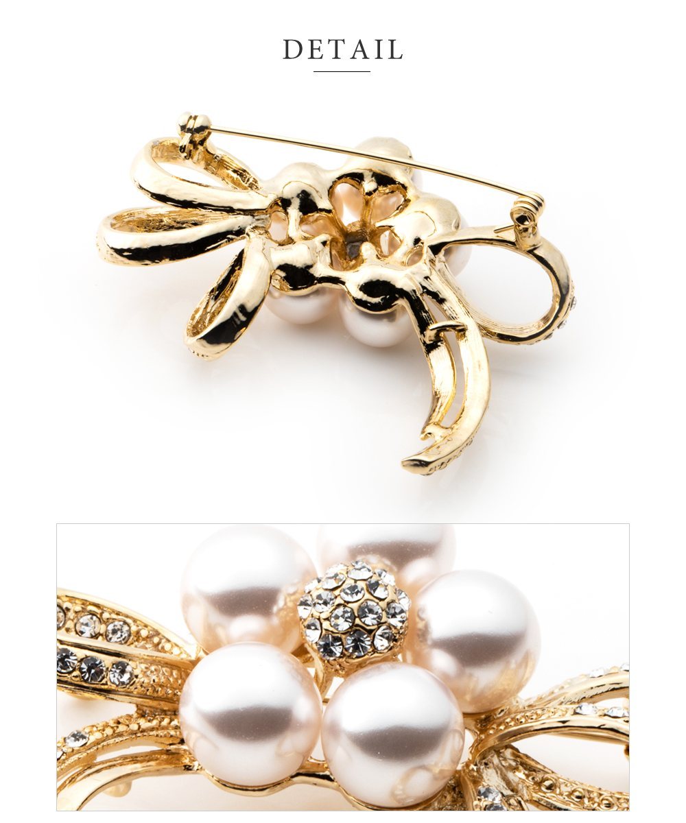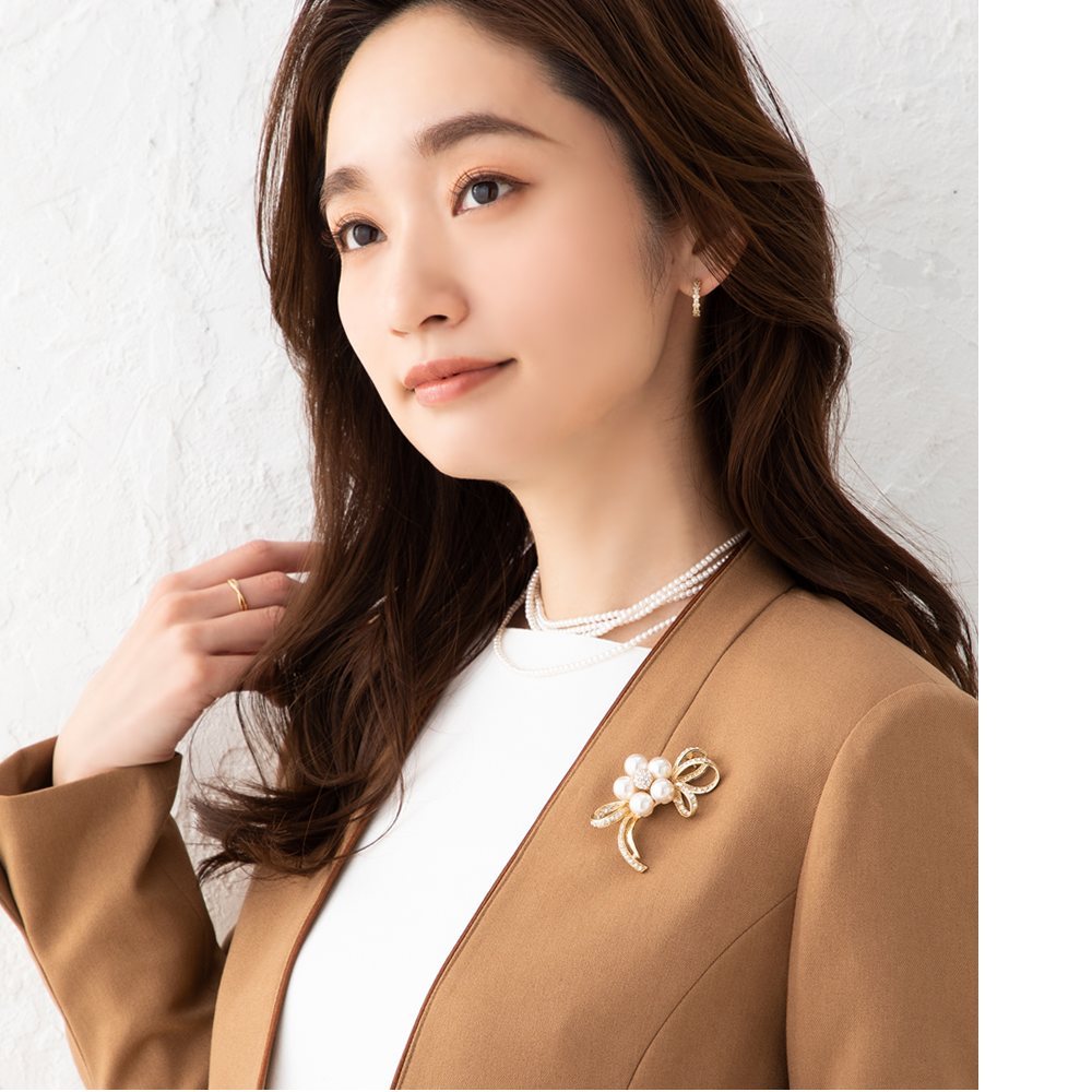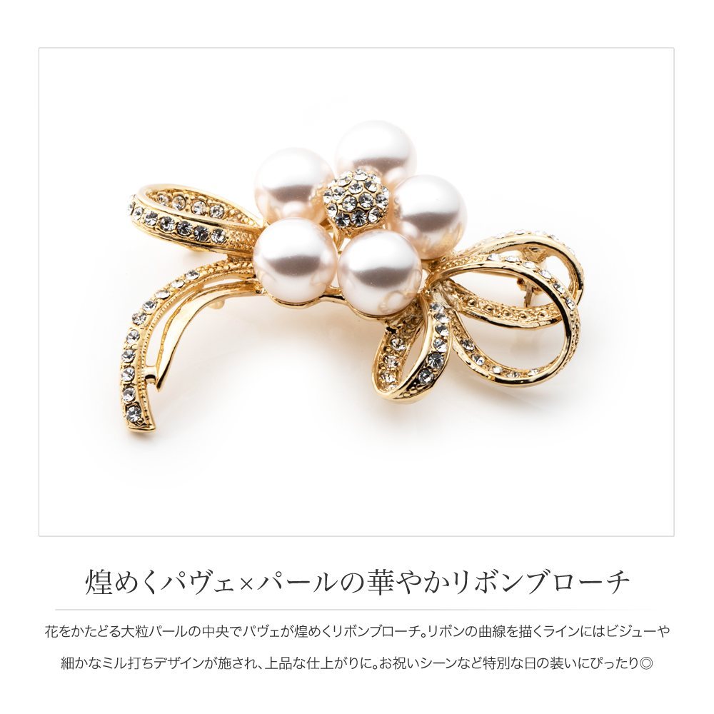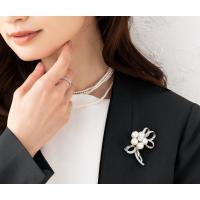 花をかたどる大粒パールの中央でパヴェが煌めくリボンブローチ。リボンの曲線を描くラインにはビジューや細かなミル打ちデザインが施され、上品な仕上がりに。お祝いシーンなど特別な日の装いにぴったり◎