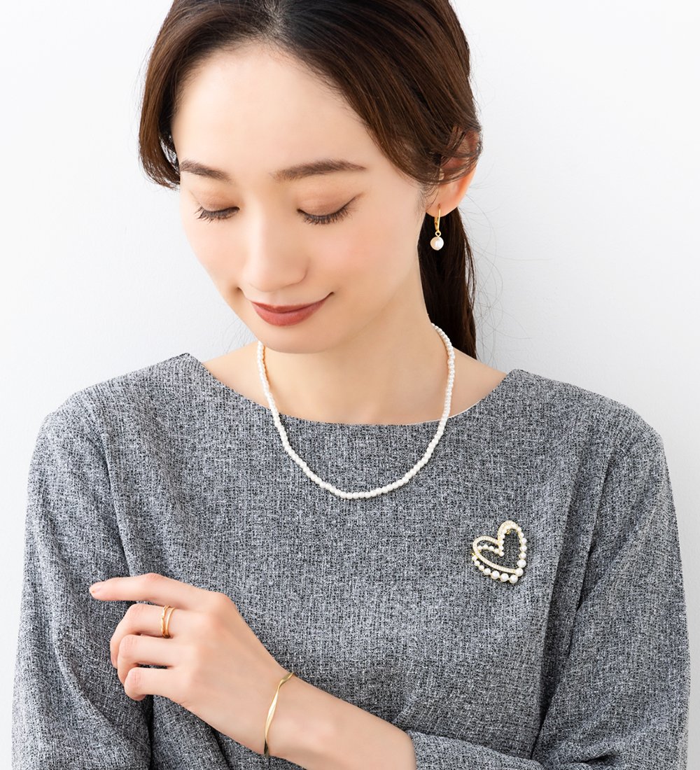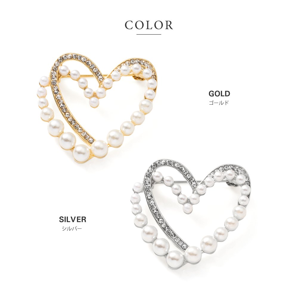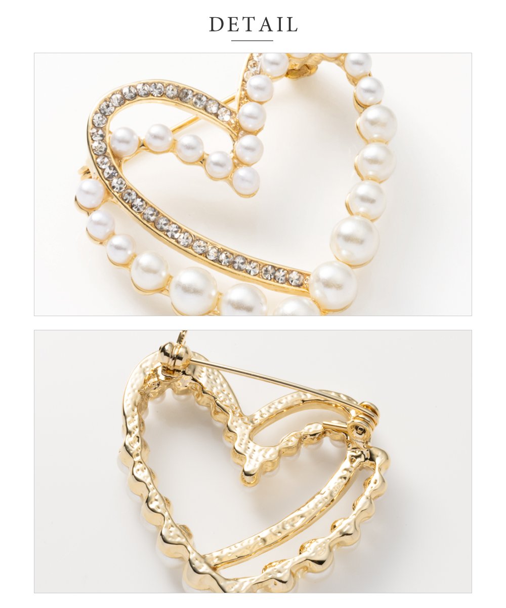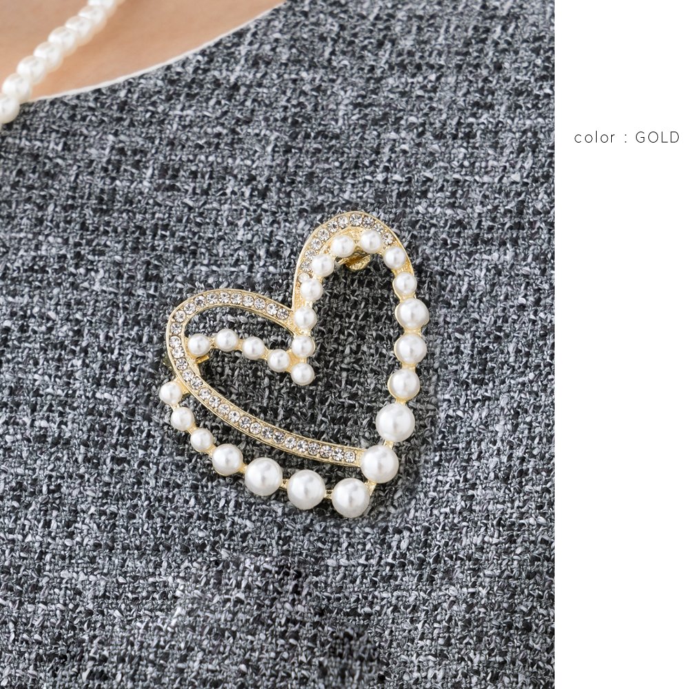 女ゴコロくすぐるパール×ビジューを重ねたハートブローチ。程よい存在感と繊細に煌めくデザインが、優美な雰囲気を高めます。お祝いシーンなど華やかな装い、シンプルコーデのワンポイントにオススメなひと品。