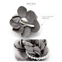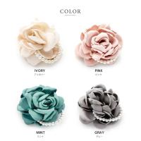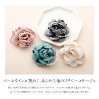 程よい光沢の花弁がたっぷり重なったフラワーモチーフに、パールラインが飾られた上品なコサージュ。スーツ・ドレスを問わず、パーティーやフォーマルシーンにマッチして華やかな装いに仕上がります。