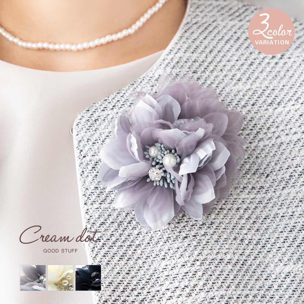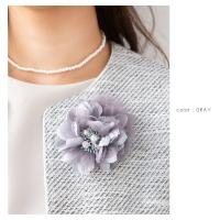 ふんわりとした柔らかな質感が優しい印象のフラワーコサージュ。同系色の異なる生地の重なりとさりげないパール&ビジュー使いが、セレモニーシーンにぴったりな品のある装いを演出します。
