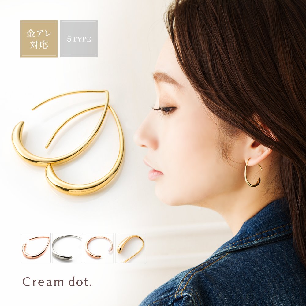 厚みの変わるカーブが女性らしい印象のドロップフォルムのフープピアスは、華奢なデザインながら存在感があり、オケージョンを選ばないので、毎日使いに活躍してくれること間違いナシのマストバイアイテムです。