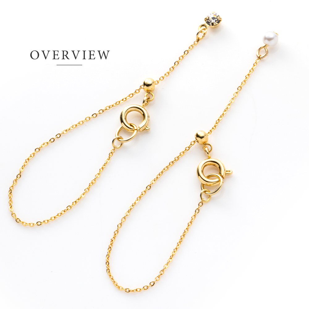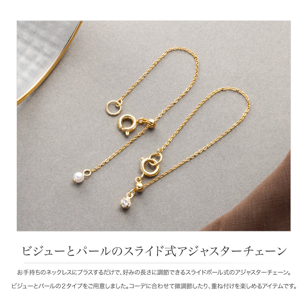 お手持ちのネックレスにプラスするだけで、好みの長さに調節できるスライドボール式のアジャスターチェーン。ビジューとパールの2タイプをご用意しました。コーデに合わせて微調節したり、重ね付けを楽しめるアイテムです。