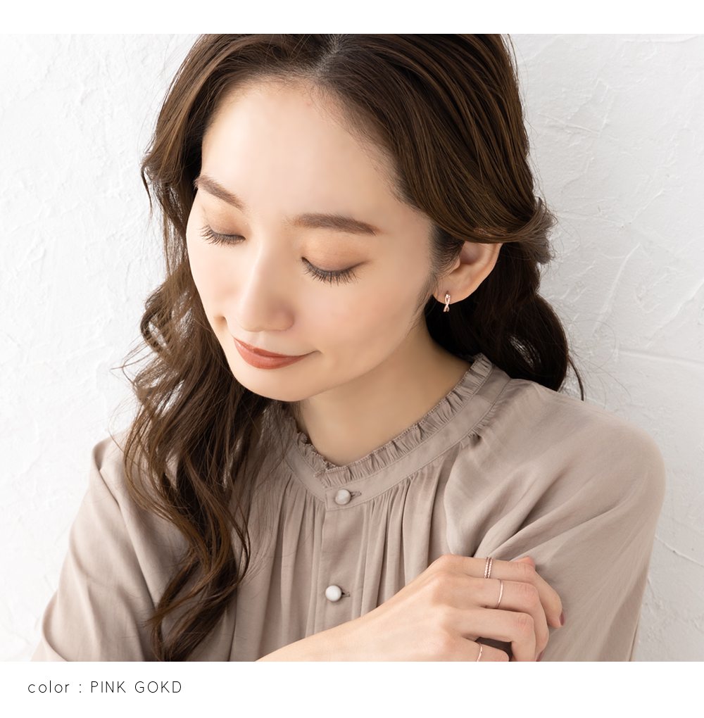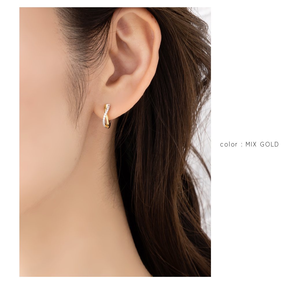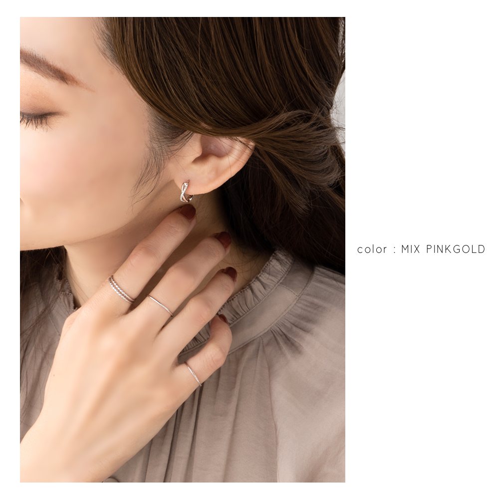 小粒ビジュー/プレーンなラインが緩やかにクロスするキャッチレスピアス。コンビカラーピアスには珍しい華奢なシルエットで、トレンド感と大人っぽさを兼ねたデザインです◎単色もご用意しました。