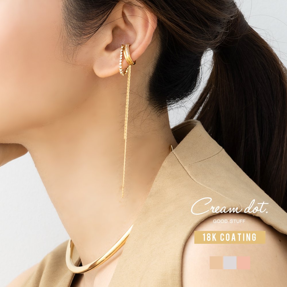 【本日限定!全品10%OFFクーポン】イヤーカフ 金属アレルギー ニッケルフリー 18kコーティング レディース 片耳用 パヴェ ビジュー チェーン レイヤード風