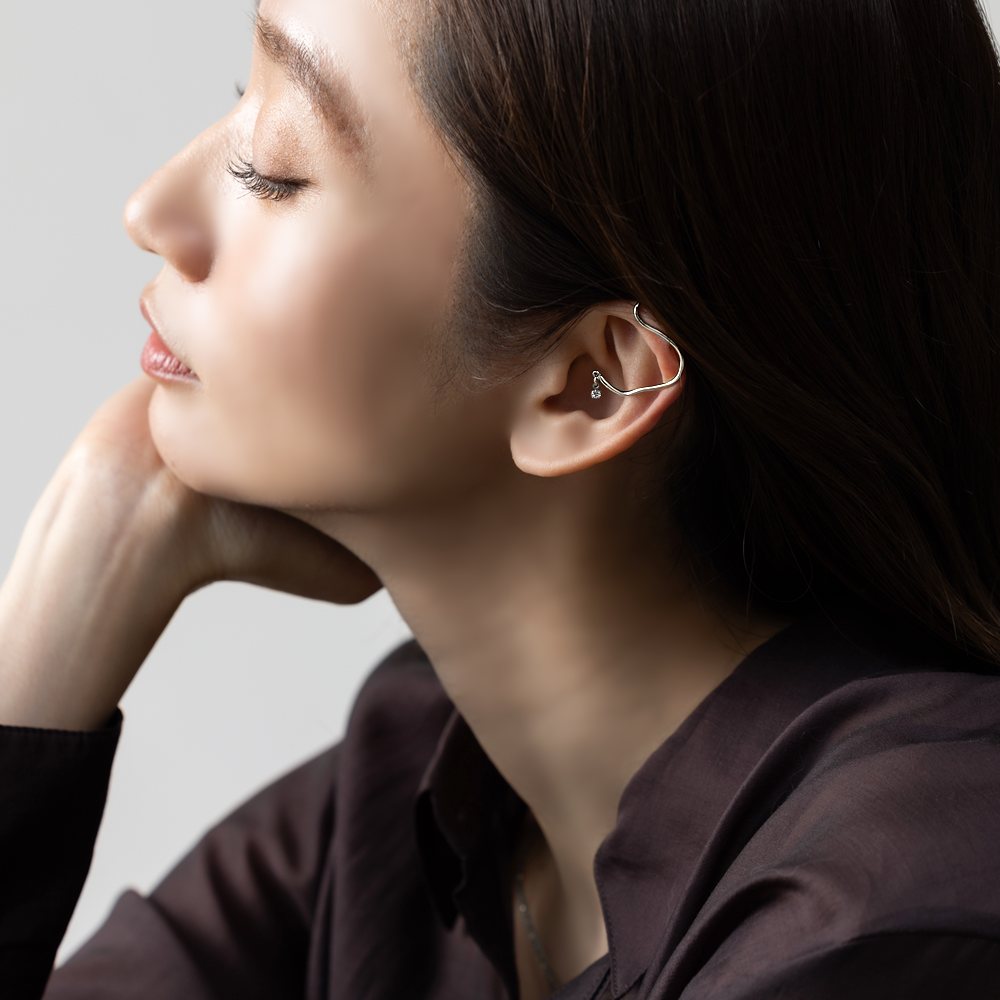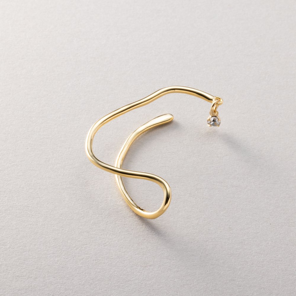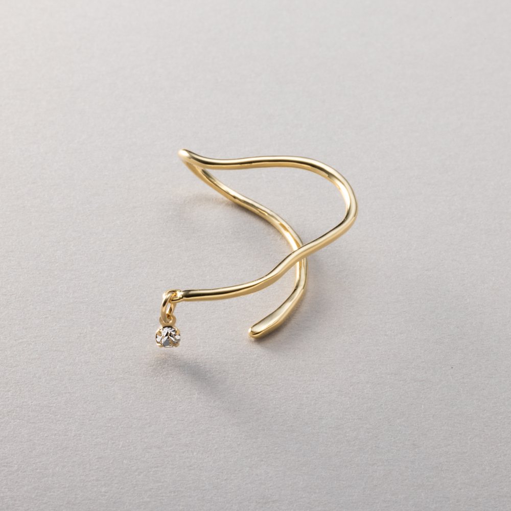 耳の外側の軟骨部分に着用するヘリックスイヤーカフ。ナチュラルなうねりのあるメタルと煌めき揺れる一粒ビジューが品良く身につけられます。単品使いはもちろん、お手持ちのカフやピアスと重ねて色々な表情が楽しめます。低アレルギーのニッケルフリー素材を使用しているので、長時間の着用も安心です。