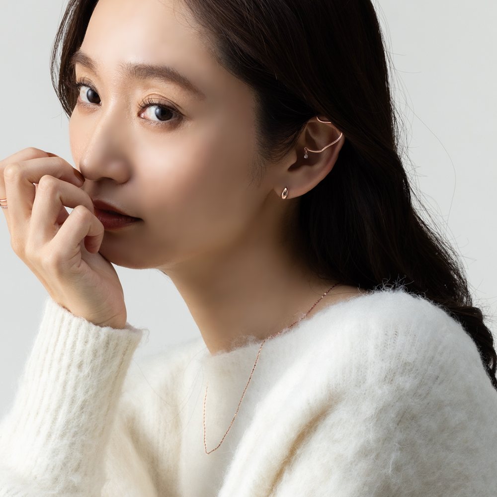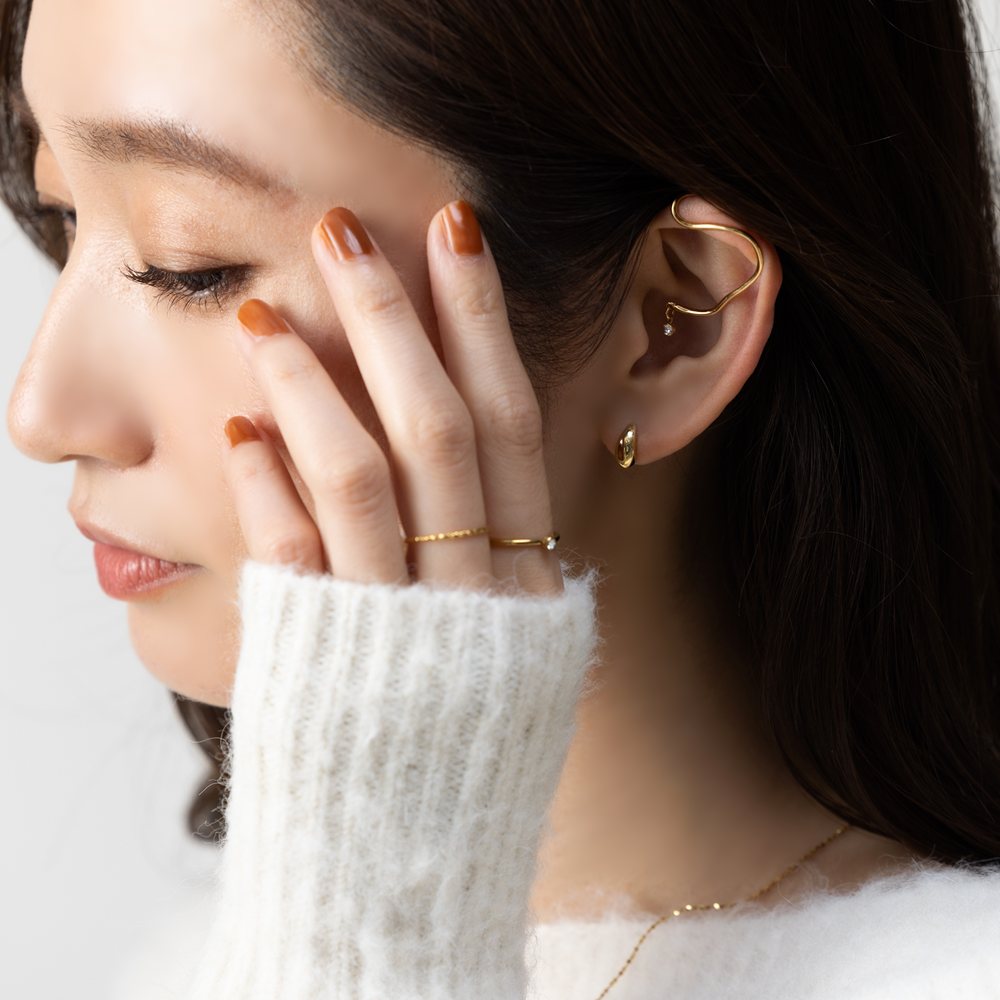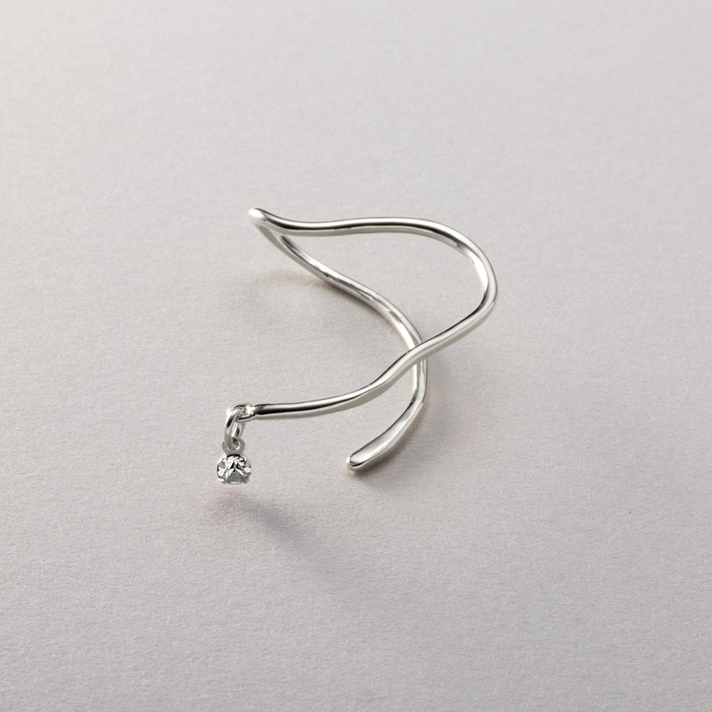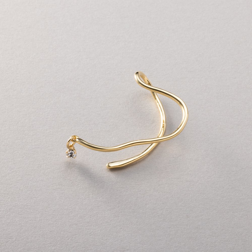 耳の外側の軟骨部分に着用するヘリックスイヤーカフ。ナチュラルなうねりのあるメタルと煌めき揺れる一粒ビジューが品良く身につけられます。単品使いはもちろん、お手持ちのカフやピアスと重ねて色々な表情が楽しめます。低アレルギーのニッケルフリー素材を使用しているので、長時間の着用も安心です。